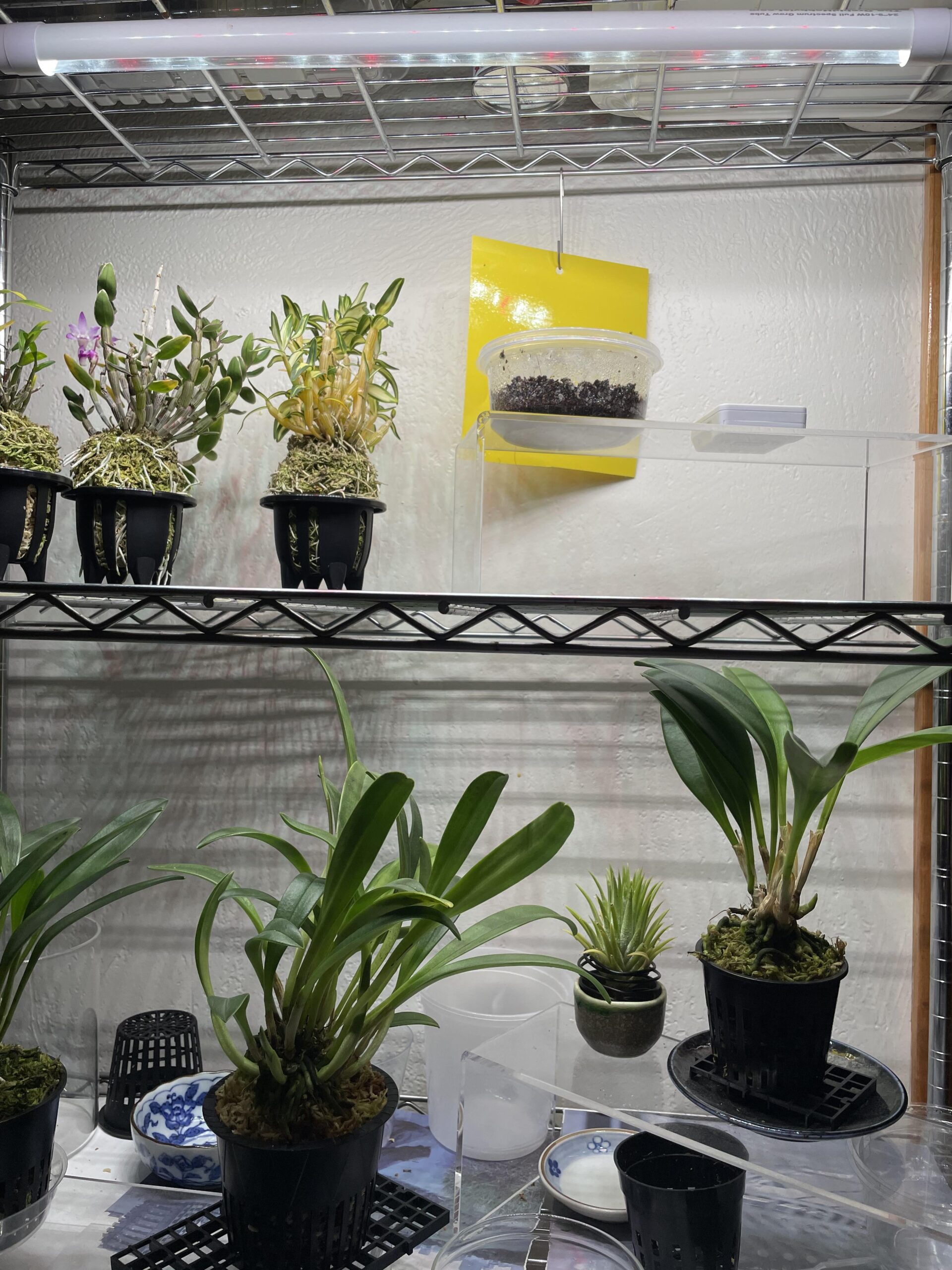I used to have it bey east window but wondered if grow lights would be better. There are Dendrobium monoliforme above and Masdevallia at the lower rack