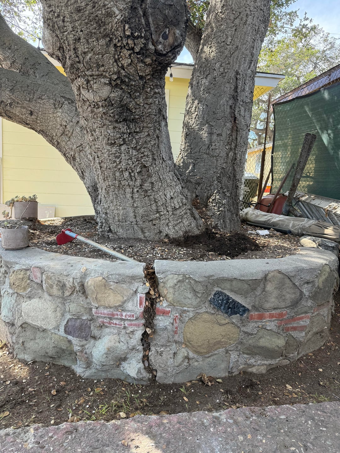 This tree has been growing like this for decades. I don’t know if it’s a tree planted in that raised planter or if they literally created that around the base of the tree.