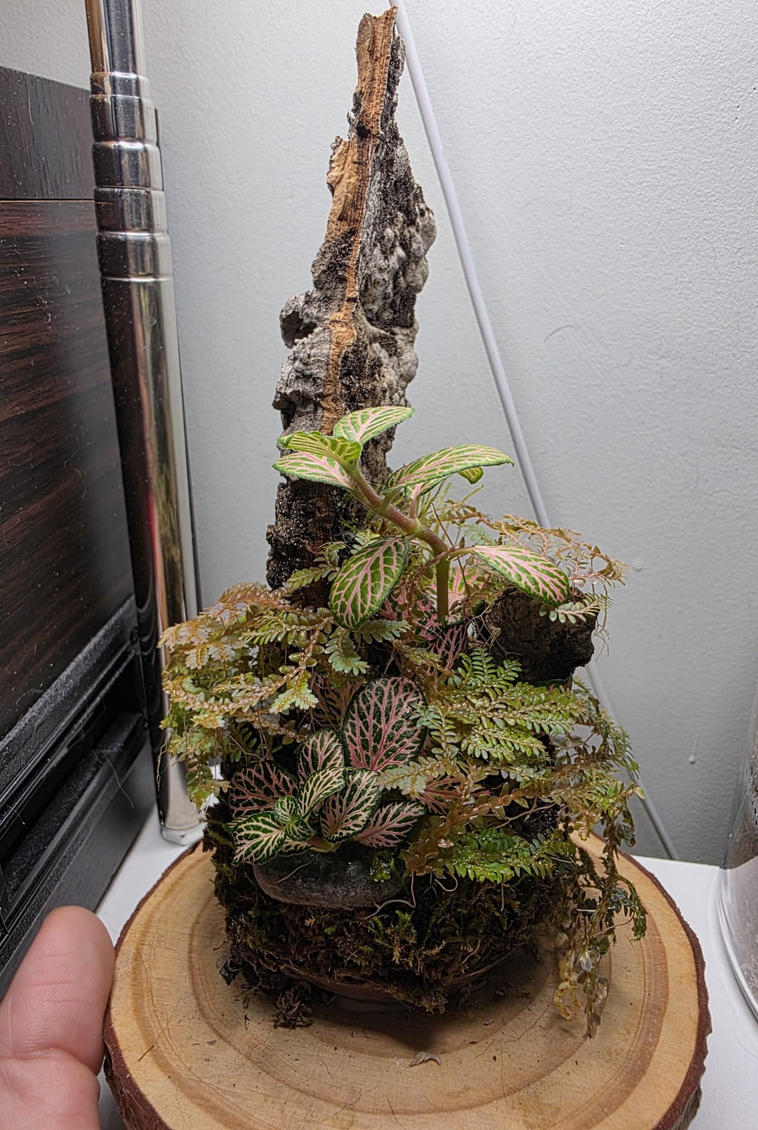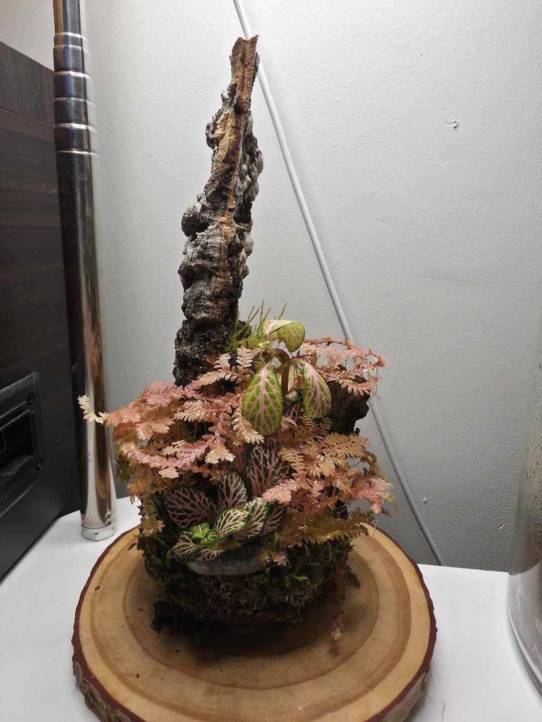 My fiance's terrarium plant has been gradually turning pink starting a month ago. The plant gets a few spritz of water every 5 days and 12 hours of light a day. The terrarium sits inside a glass dome cover. Anyone know what's wrong with it and if he can nurse it back to health? Thanks.