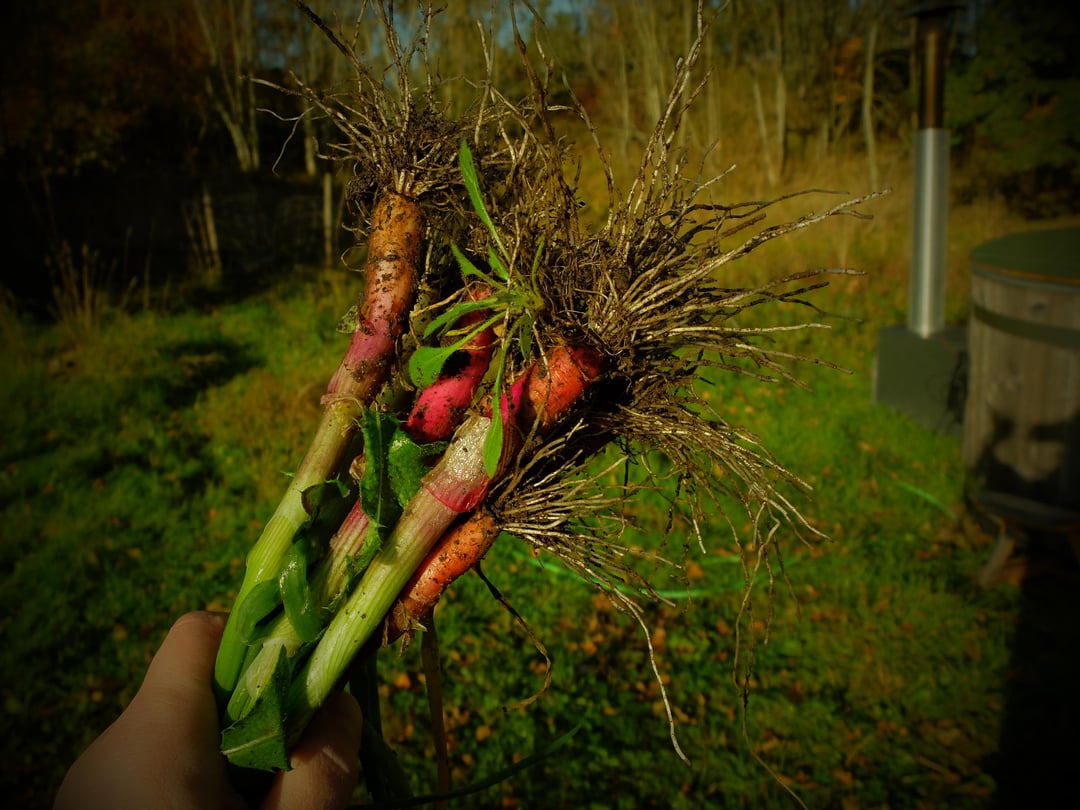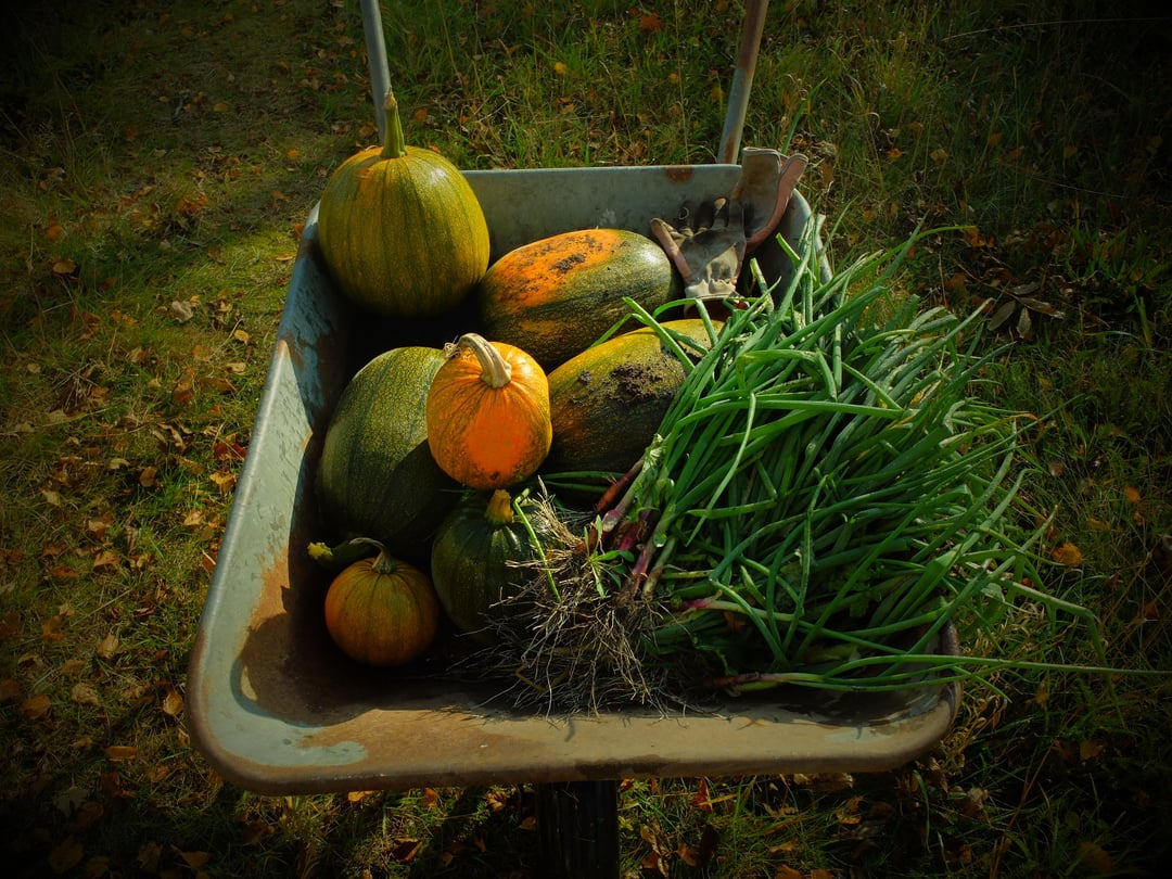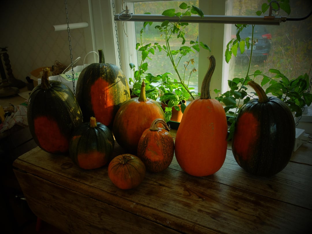 Hello, fellow gardeners! We have a beautiful autumn in the West of Sweden, but winter is undeniably preparing to arrive. This morning, I was greeted by chilly air and a really frosty garden. The gentle sunrays of the morning made everything look like it was covered in diamonds! But the beauty reminded me of my onions and a few pumpkins still left in the ground. I had hoped I could let them grow a little longer, but the frost changed my plans. Here is the last harvest of the year – a few really big pumpkins, and a big batch of onions I now have to clean and prepare for long storage. I love winter, and yet I cannot help noticing that I already miss my garden!