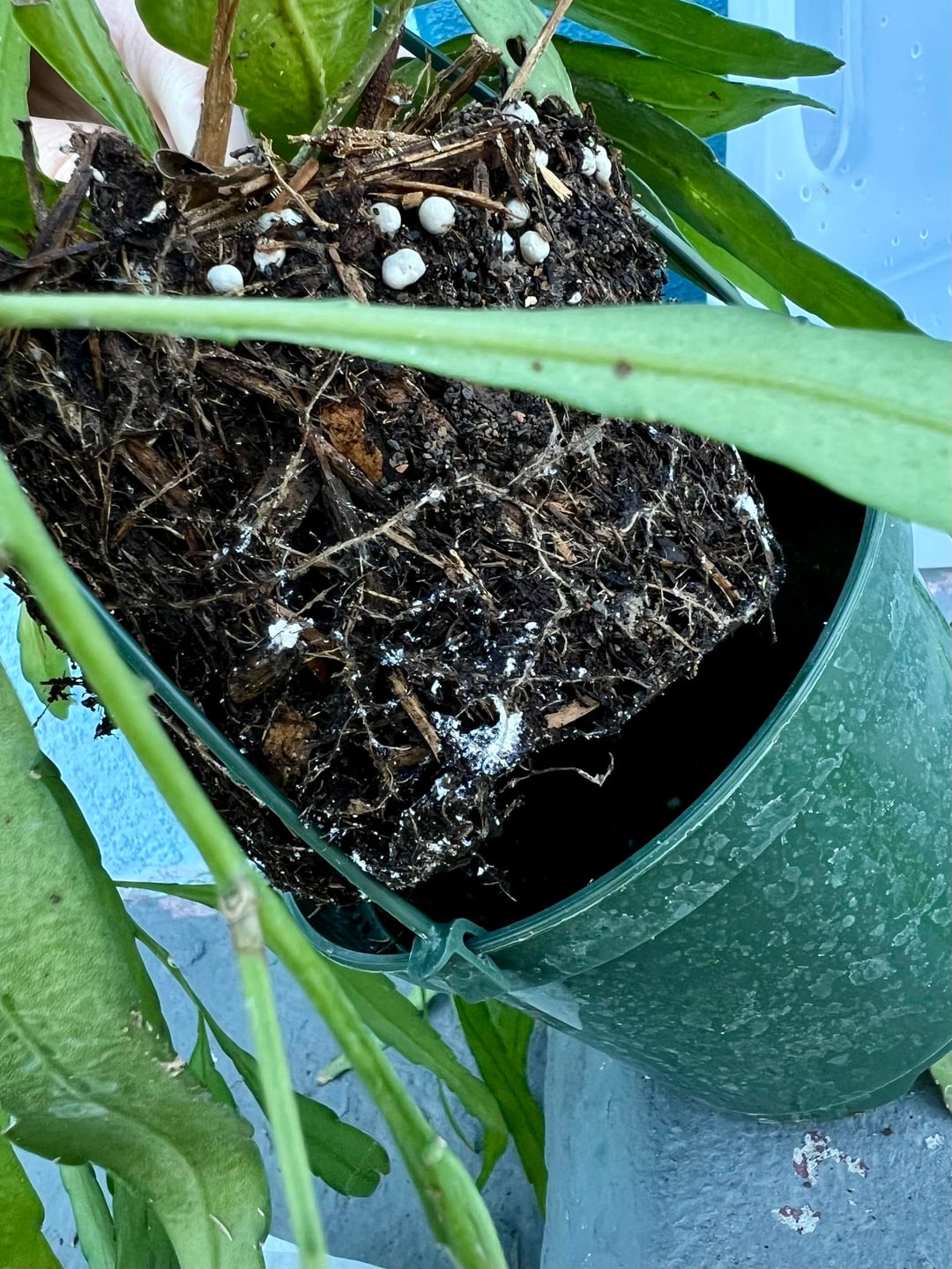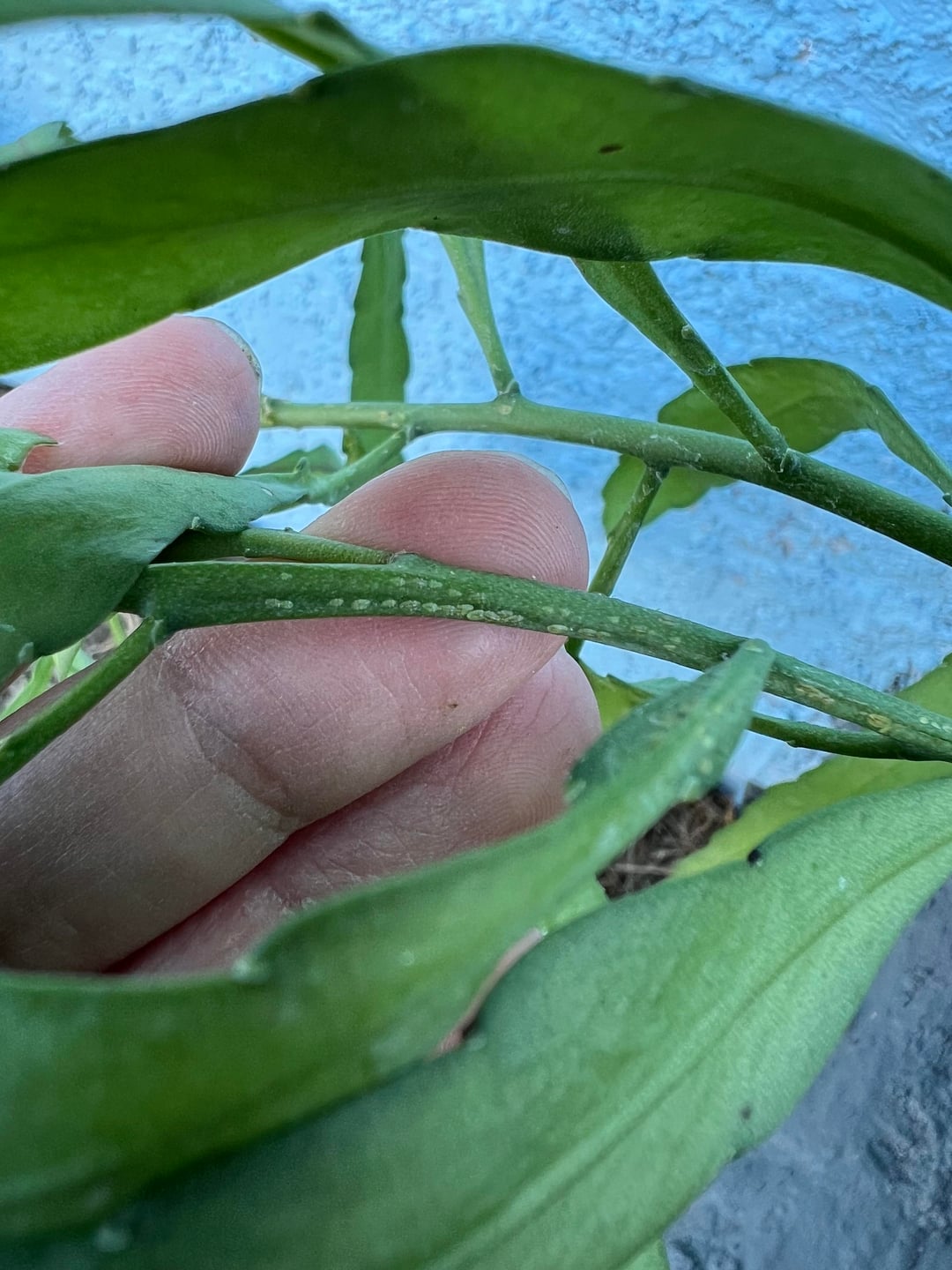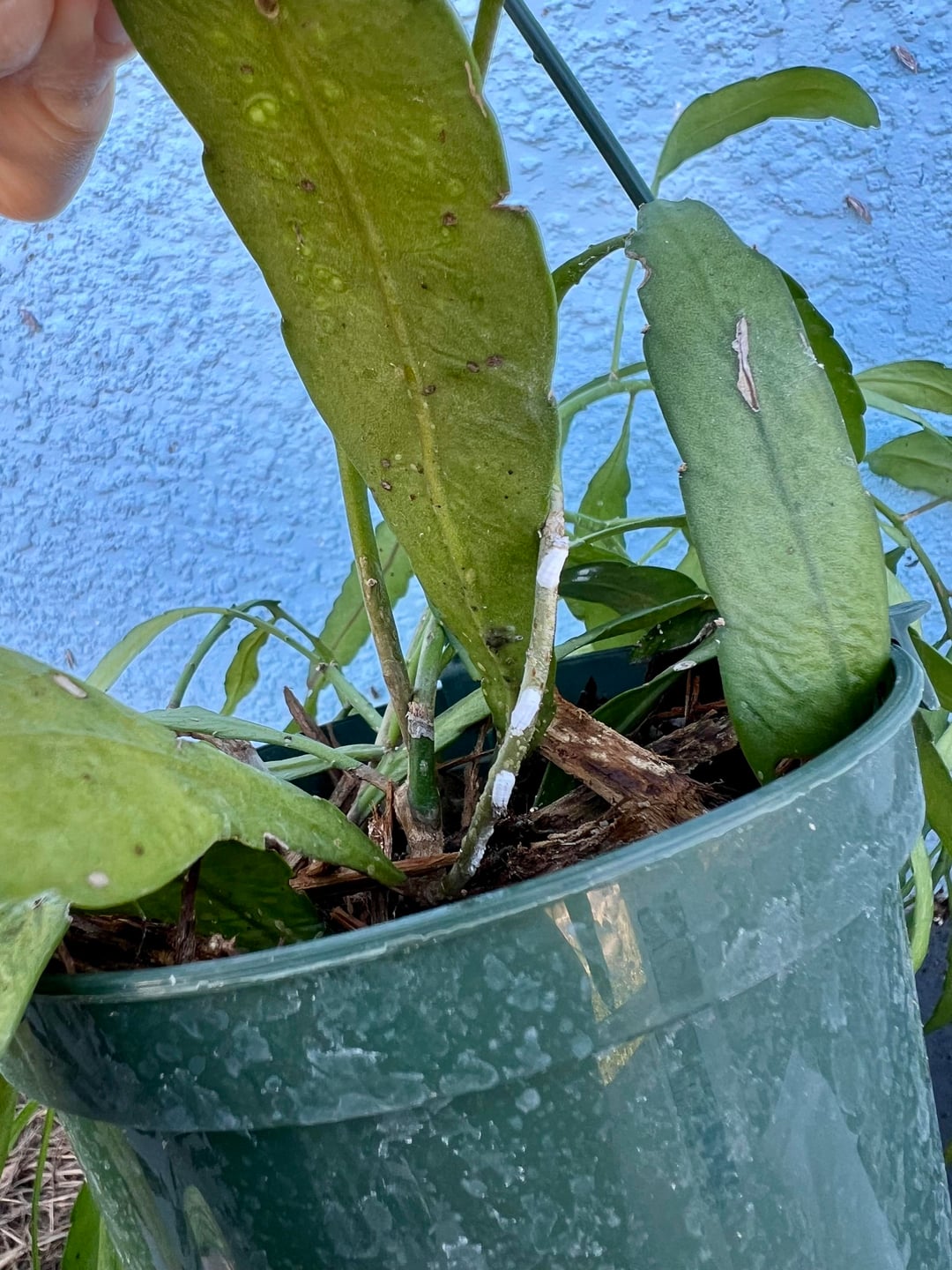 Hey, y’all. Relatively new plant parent and first time dealing with a malady like this. Noticed these today when I went to water my pseudorhipsalis. Quarantined the plant and scrubbed the leaves down with rubbing alcohol but I have no clue how to tackle the root situation — not even sure what I’m dealing with. Normally hangs in an east-facing window but I have it outside in the shade right now away from my other plants.