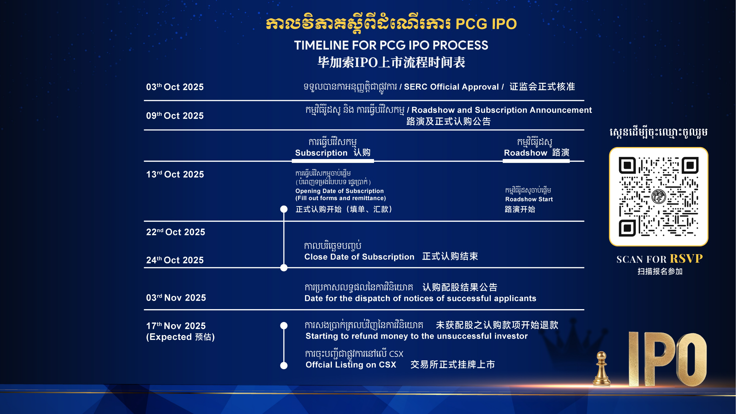 Additionally, PCG conducted provincial roadshows in Kampong Cham and Siem Reap, where they received enthusiastic interest from investors nationwide. The IPO offers shares priced at KHR 4,800 (about USD 1.20) and provides appealing benefits, including a guaranteed 7% annual dividend for the first five years.