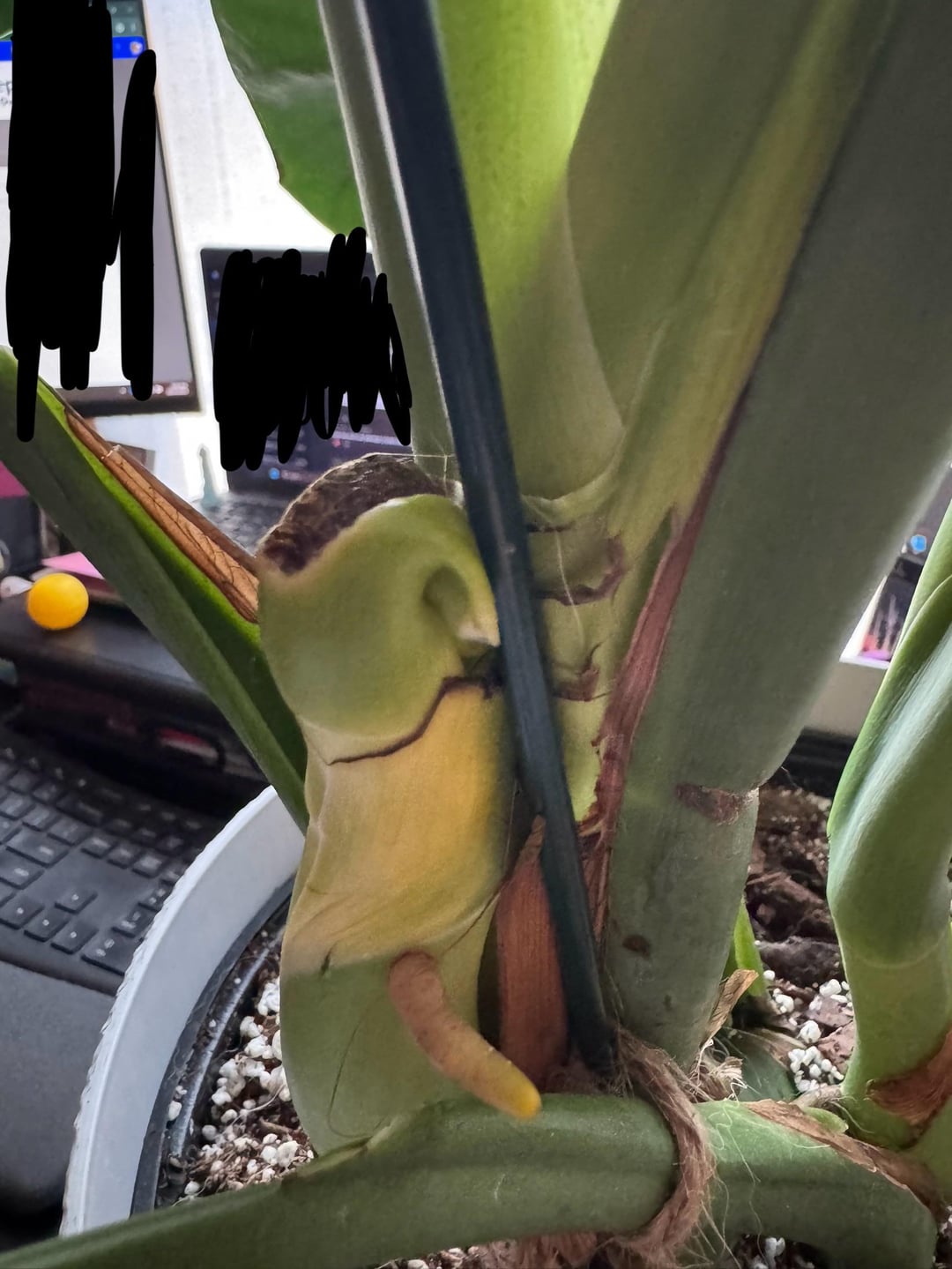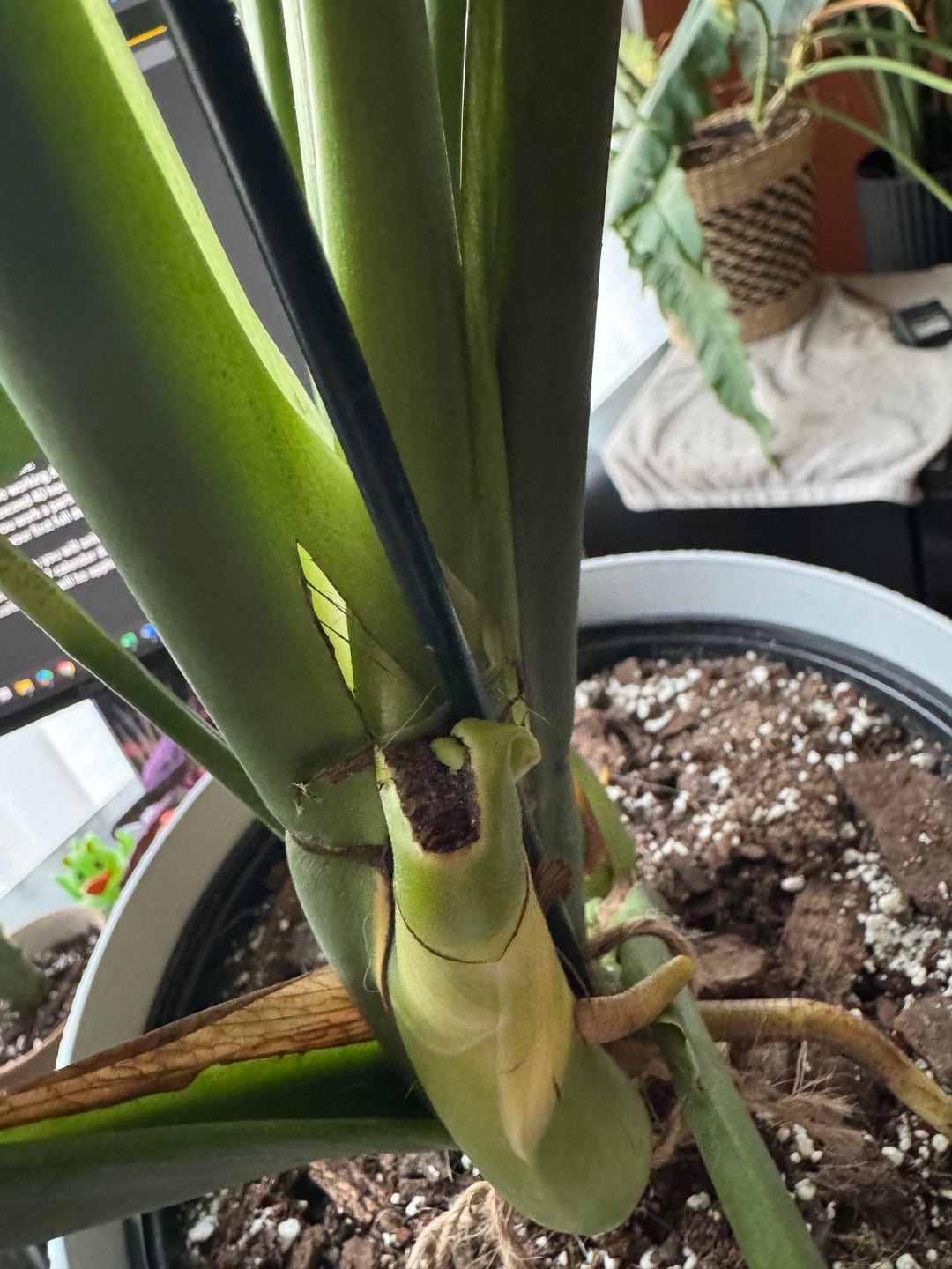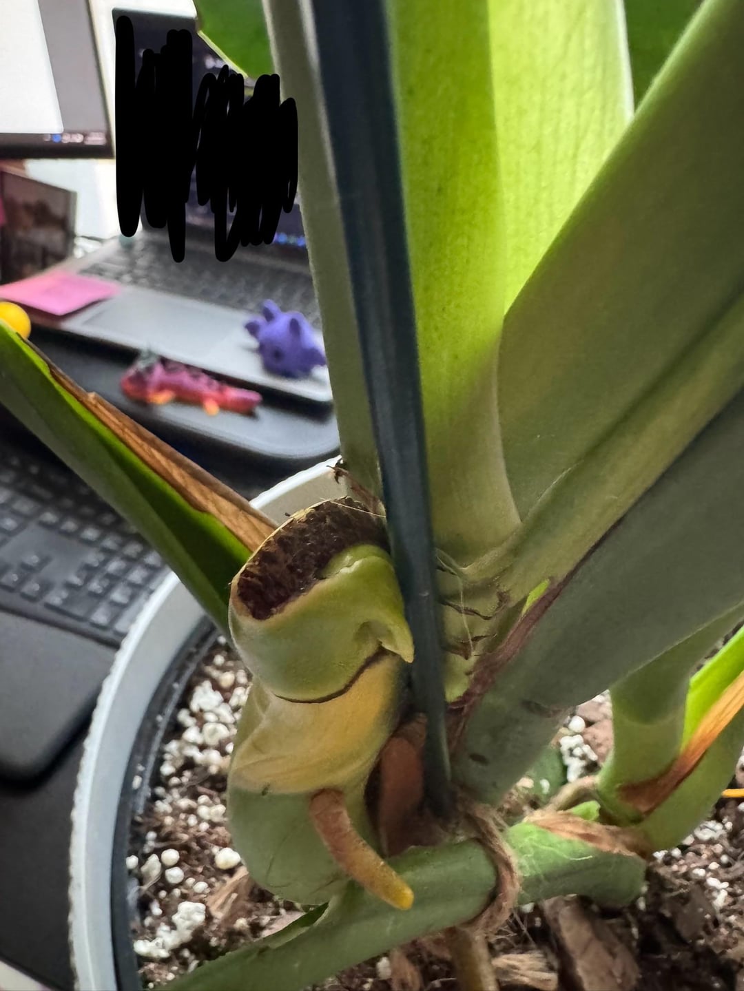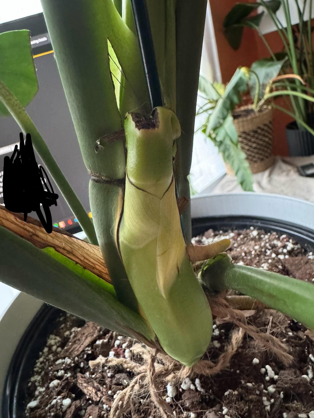 it’s got like this black crust on it and seems like at one point was gooey? I keep it inside in an east facing window. I water it about once a week when the soil is dry (I use a moisture meter). I put it in my shower and drown it then let it drain before putting it back in it’s spot.