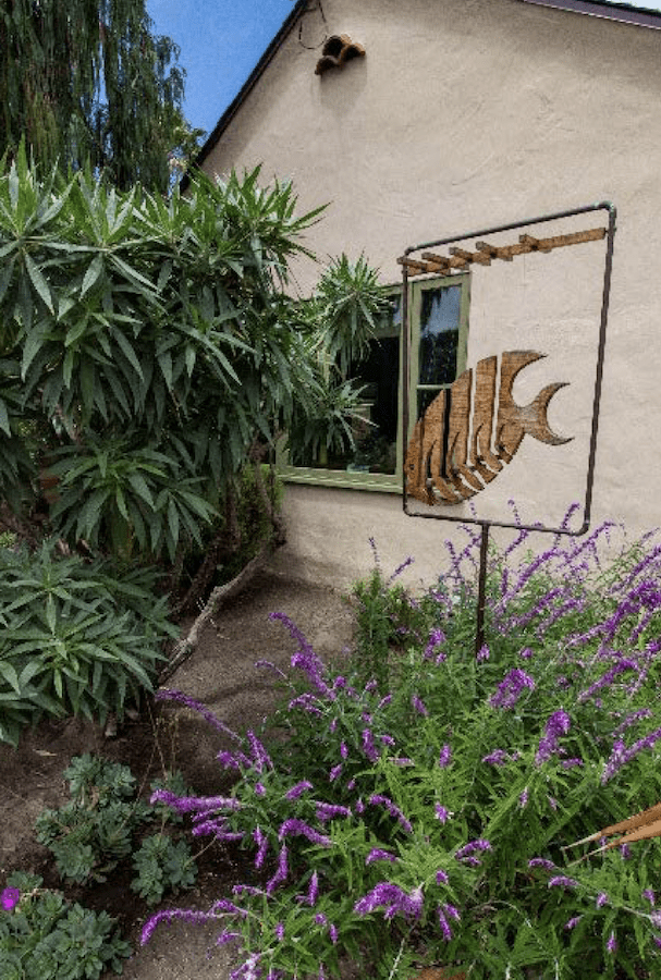 Swinging fish art in the yard of Fred and Janice Maggiore, the 2025 City of Santa Barbara WaterWise garden winners (courtesy)