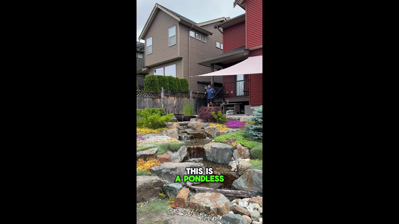 This is a pondless waterfall in Quitlam, British Columbia by Streamwork Designs. I’m going to tell you my three favorite things and what it would cost to replicate in your yard. My first favorite thing is this is the entrance way where they park their cars to get into the house. Every time they come into their yard, this is what they’re greeted with. My second favorite thing is the living area. They’ve got this beautiful outdoor furniture, the sunscreen, and this is where they spend all of their free time. My favorite thing is how the homeowner landscaped it with all of these beautiful ground covers that make it look so inviting and natural and almost like a paving. This masterpiece of a project by Streamwork Designs was created for $45,000.