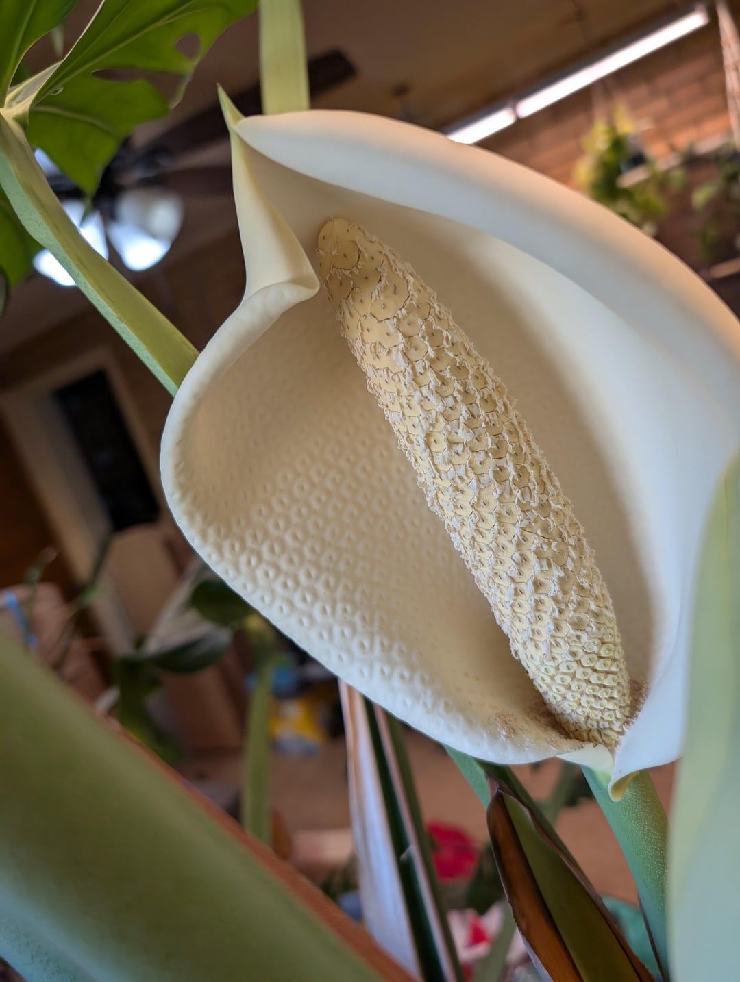 The fruit is the cone in the middle. The white outer leaf will turn brown and fall off. The cone will turn green and ripen slowly. Mines been green for over a year now. The little segments will start to come loose and it will smell like tropical fruit when it’s ripe. Enjoy.