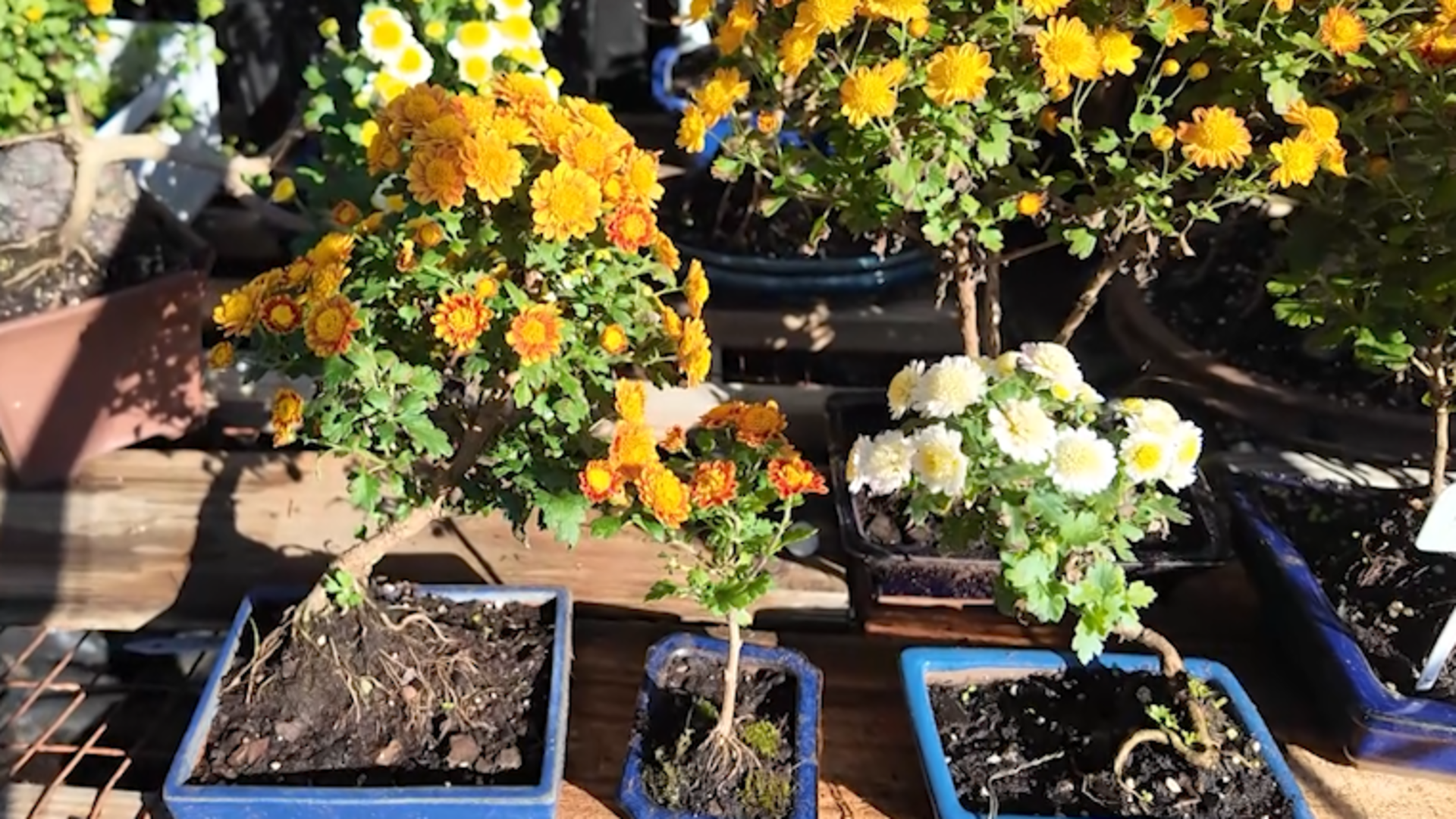 It’s not just the variety of mums that make John’s collection so special, he’s also growing them in really fascinating ways. One display has mums trained as bonsai. Unlike typical bonsai trees, which can take decades to get their shape, John has been able to grow these mini-chrysanthemum trees in a single growing season. However, that doesn’t mean growing chrysanthemum bonsai is an easy feat. These plants need to be pruned enough to keep their shape, but not too much so that they don’t grow flower buds. It’s a difficult balance that comes with decades of experience.