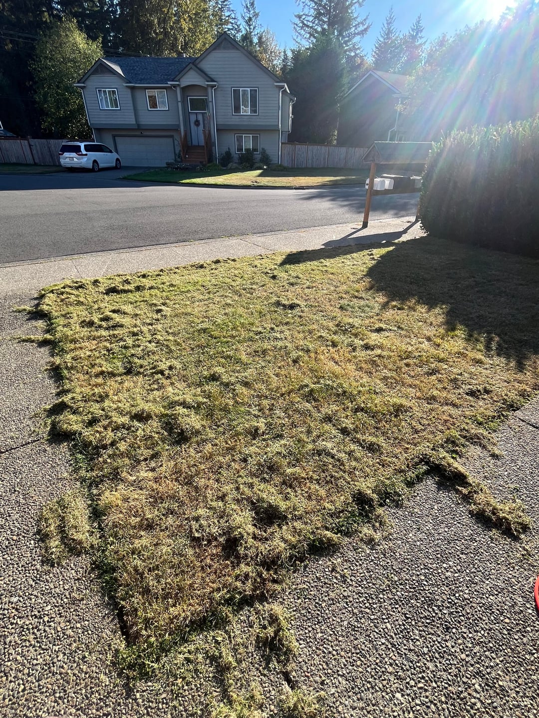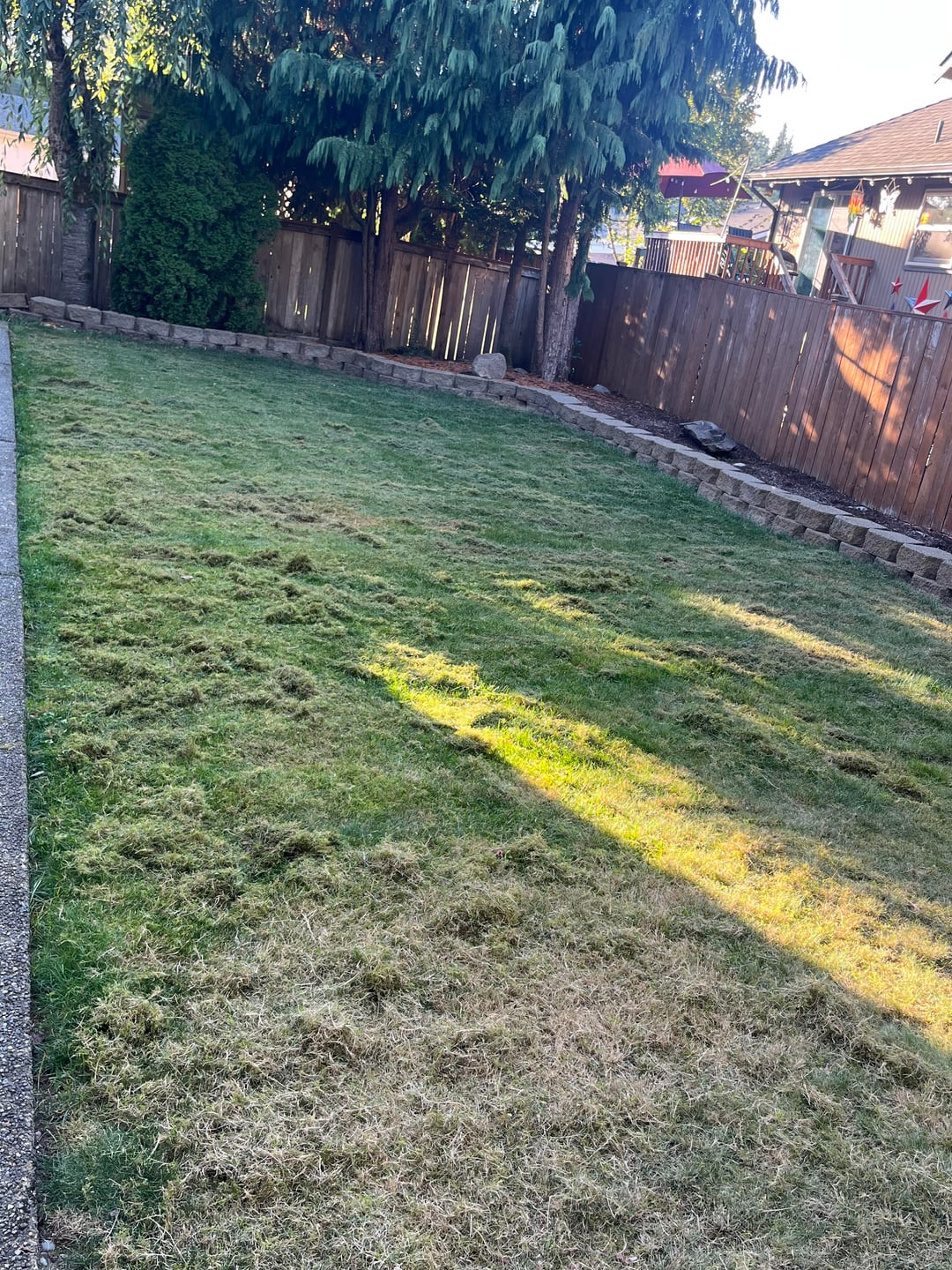 Here’s my progress so far, before/after. I weeded manually (have a dog who’s all over the lawns so I try to avoid chemicals where I can), dethatched and fertilized and then overseeded with JB sun and shade seed grown in Oregon (got from my local Home Depot, looking for something that was just pure grass seed) on 9/28. It’s getting into rainy season now, so I did one more round of fertilizer a couple of days ago before the rain hit.