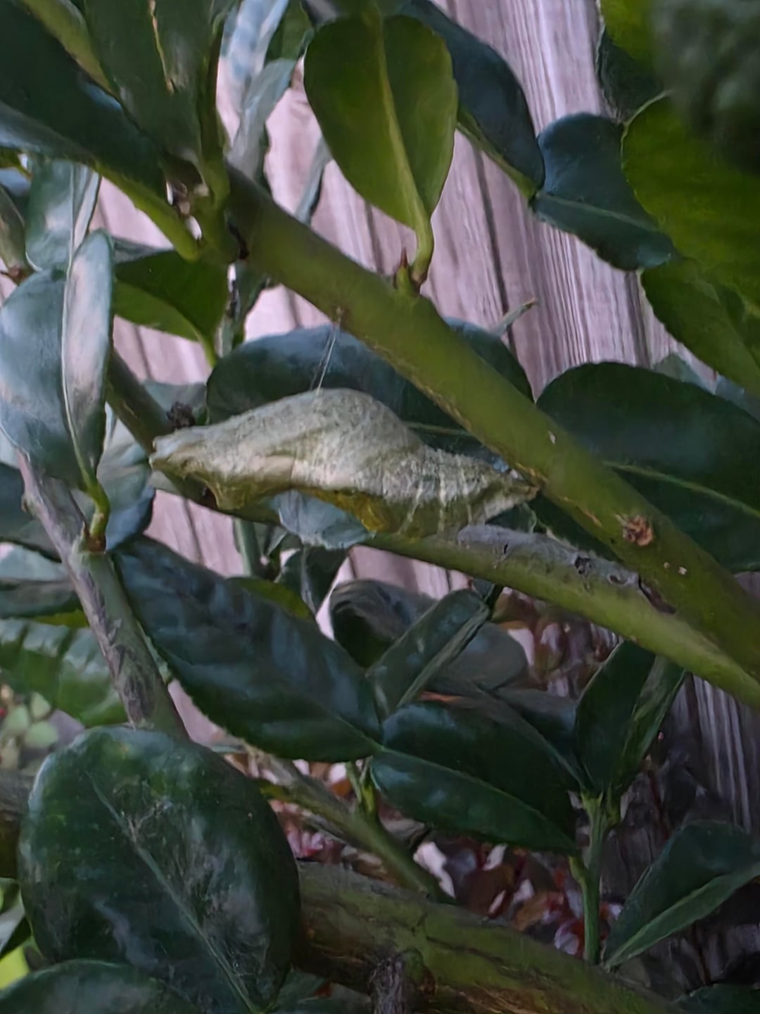 Been following this little visitor on my kaffir lime tree for a couple weeks. Started out looking like a bird poop, very quickly it got massive and now a chrysalis. The second last photo was this morning where it had attached itself to the branch and by tonight it had completed the chrysalis to become a butterfly.
