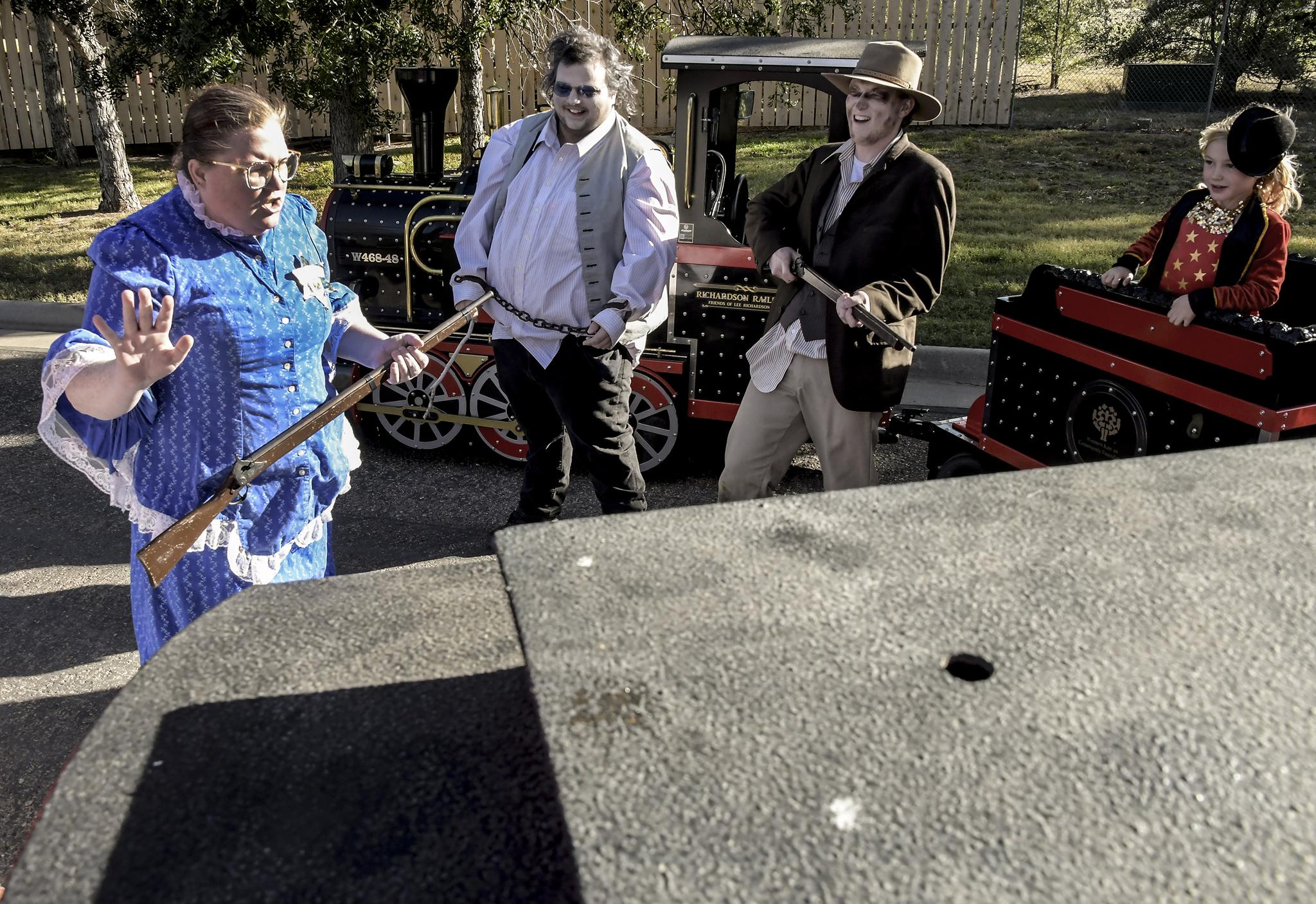 A group of actors from Dodge City’s Depot Theater performed Saturday in Garden City during the Friends of Lee Richardson Zoo’s annual Boo! at the Zoo event at the zoo. The group staged a train robbery by ghosts, with the bounty being candy from train riders. Amanda Boles. left, played the sheriff while Brogan Tweedy, center left, and Skyler Gessel, center right, portrayed the ghost robbers. Carrie Boles also performed in the group. BRAD NADING/GARDEN CITY TELEGRAM