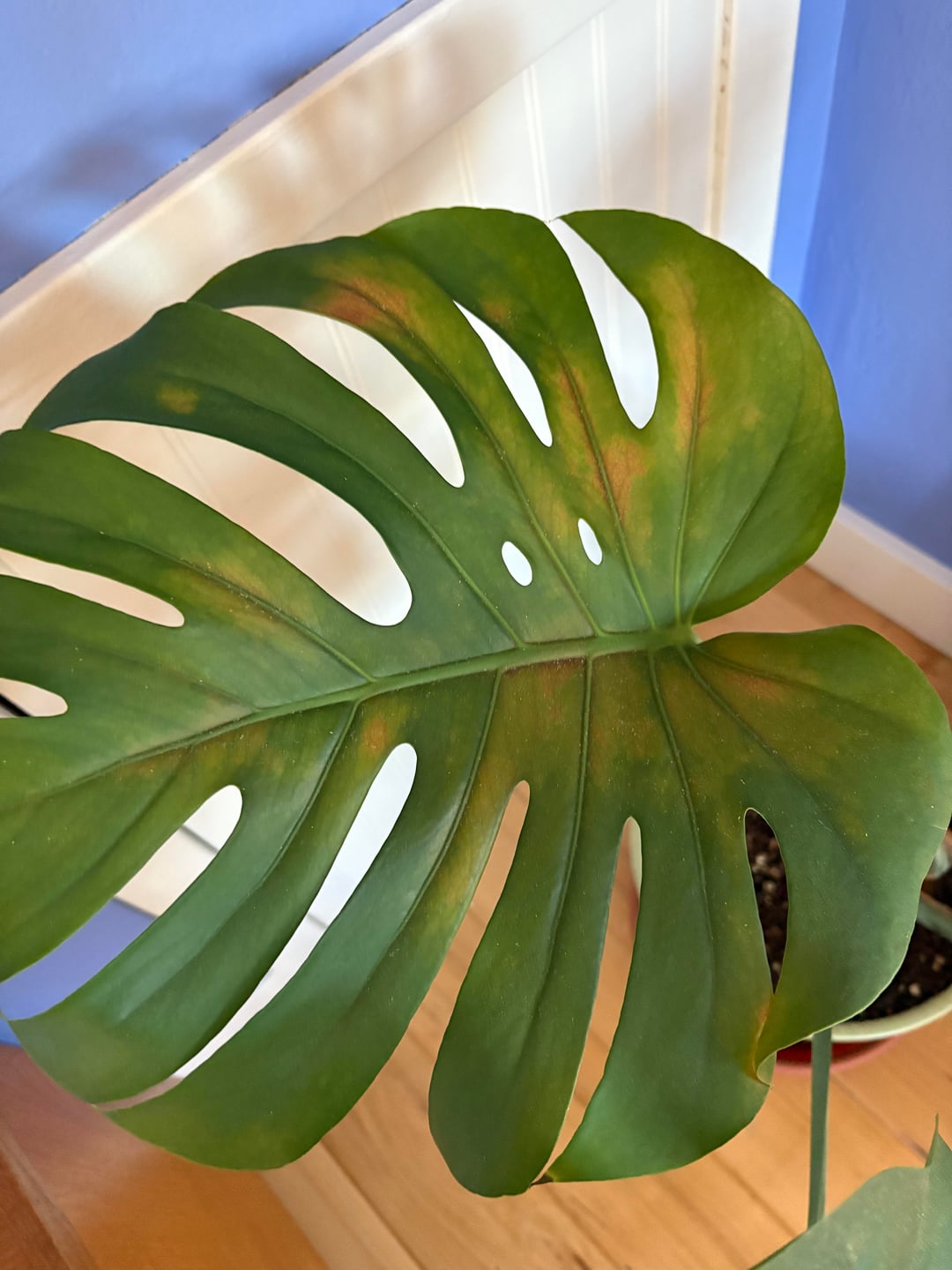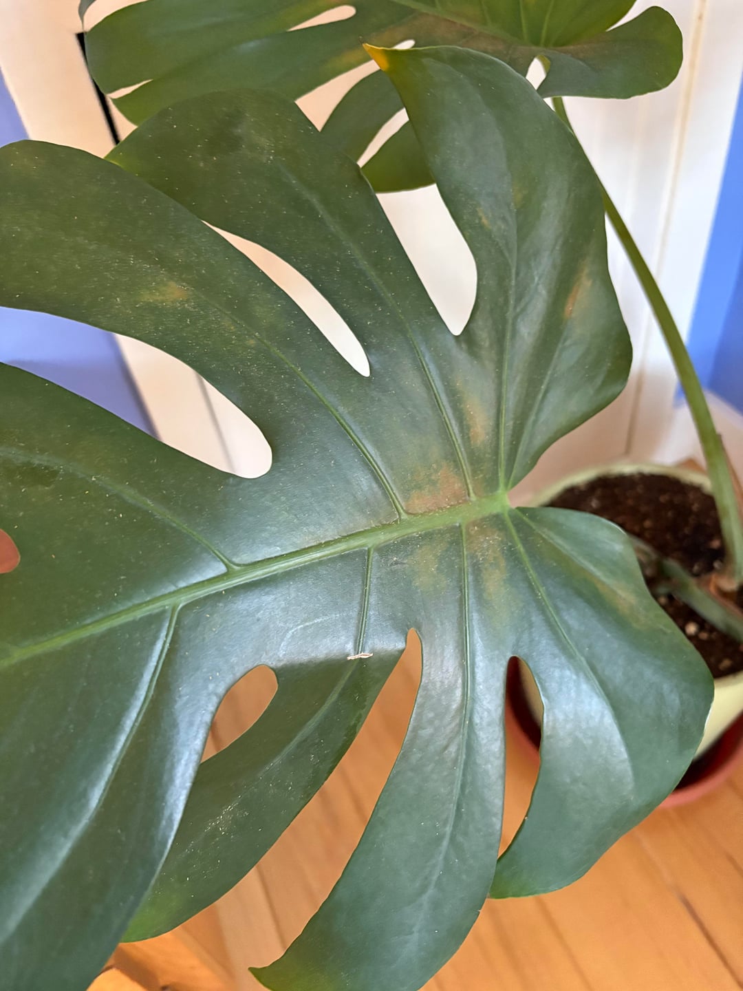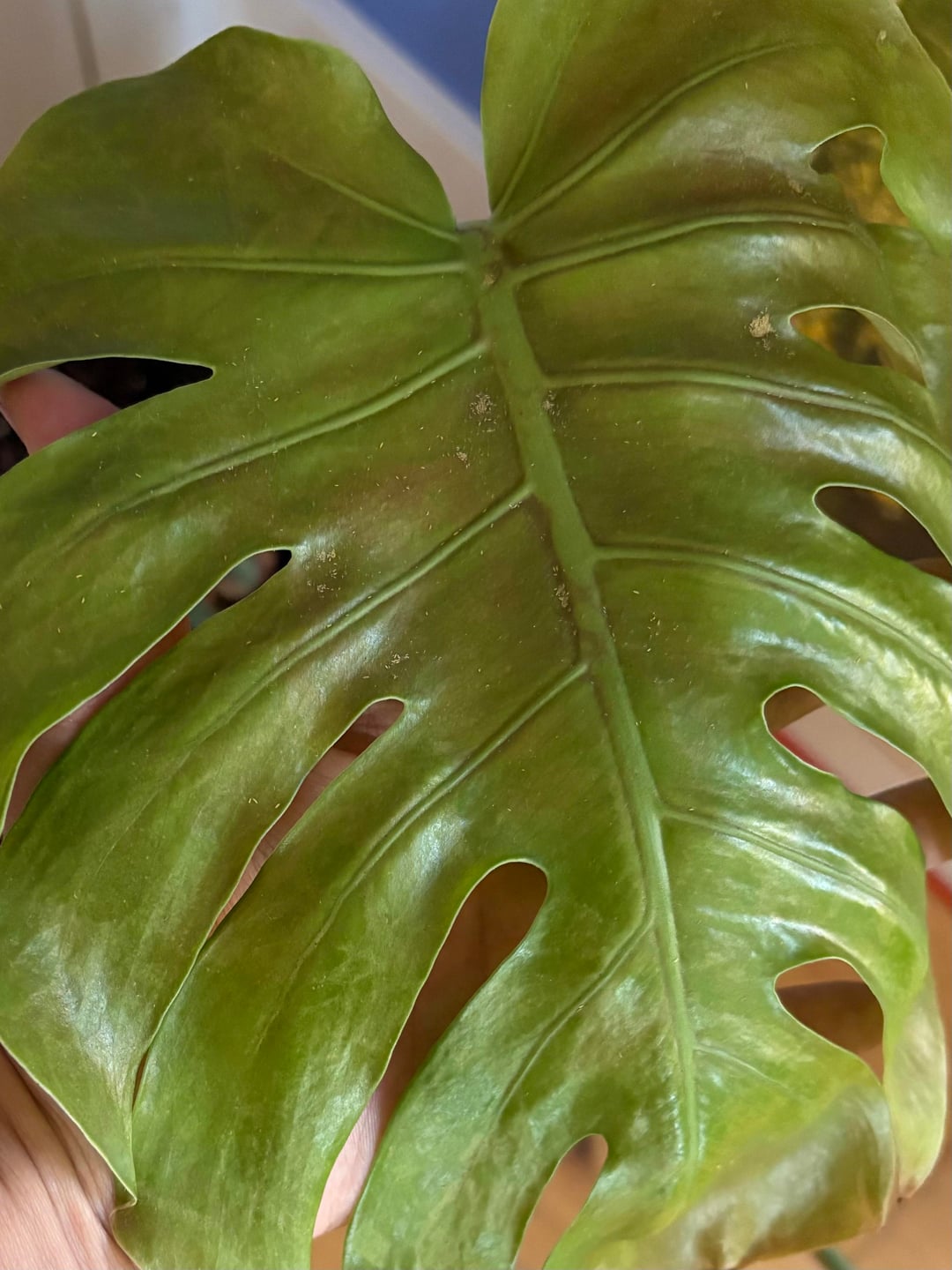 One of my friends gave me a monstera with dark colored damage like this. She mention she had a bug infestation but didn’t specify what it was. Ive had the plant for a while and repotted it, added systemic granules, washed it down with a hose and added neem/castile/water combo twice to the leaves. Theres been new growth since then, I dont see any bugs moving but the reddish damage is still on some of the leaves. Does this mean theyre gone? Or is there still an active infestation? 🥲