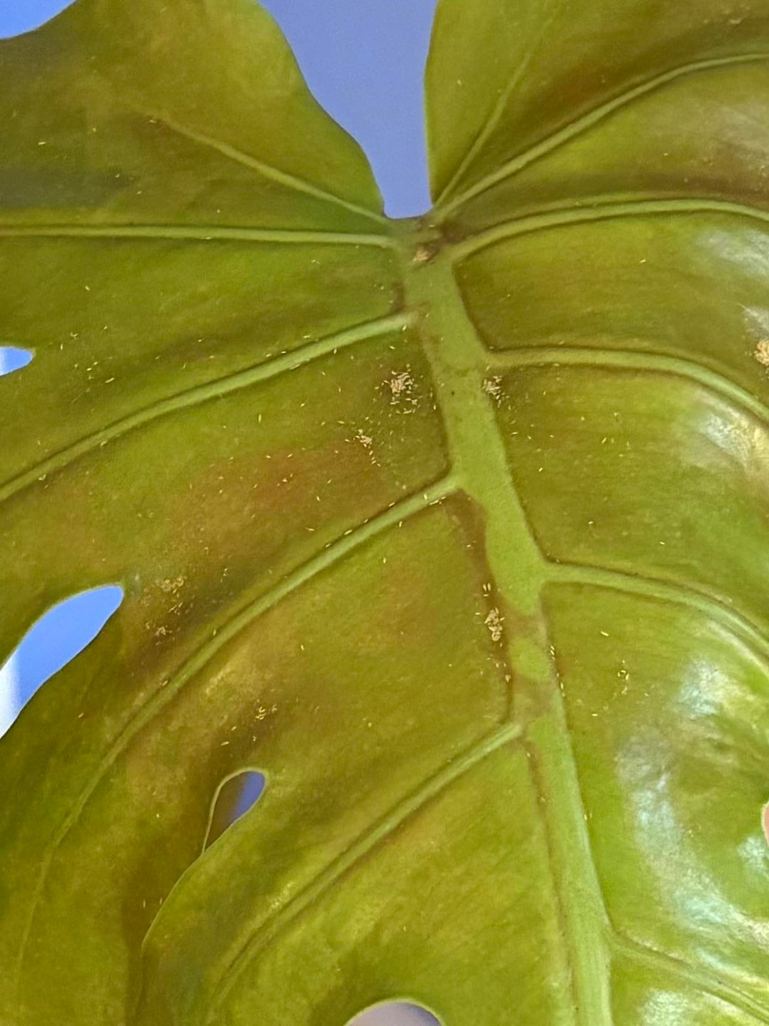 My monstera’s leaves have been turning brown from within, even the new bright green one pictured here. Upon closer examination I found these tiny bugs, so small they were formerly perceived by my eyes as dust. What are they, and what can I do? Thanks, community!