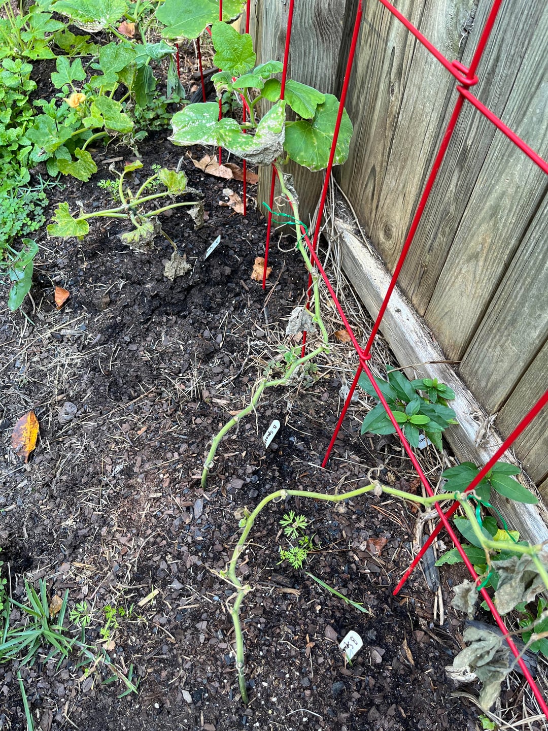 This garden is in 8a. We tried growing Butternut and Acorn Squash, but they look dead or dying. In the second pic you can see an acorn squash was trying to grow but turned yellow and fell off.