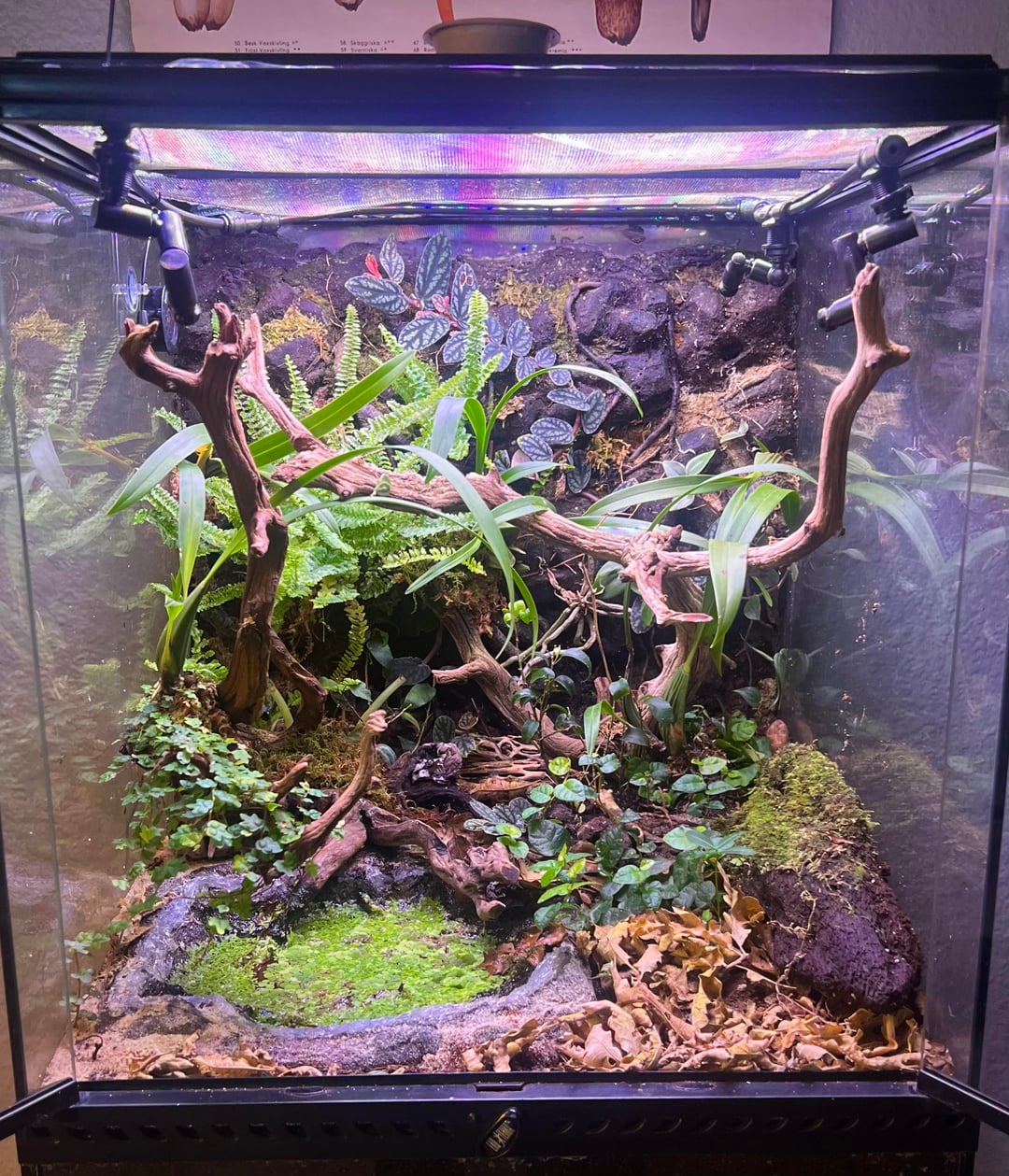 The substrate is quite thick, and the puddle is maybe a couple inches deep at most, with all slanted edges. No filtration because such small amount of water. It’s basically a giant brick of Expanding foam with pond carved out and covered in silicone/sand. capillary action is stopped with thin line of silicone and have not had any issues with leakage. There are orchids, ferns, vines and moss. I hardly see the Geckos as there are so many hides. They eat fruit flies, isopods, mantis nymphs, and Repashy Gecko Food.