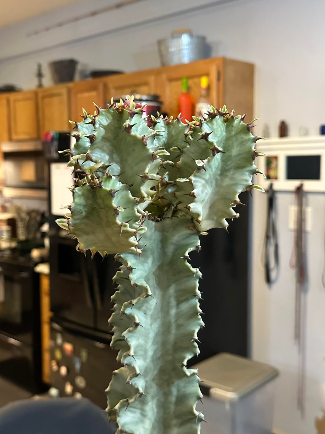 This one is over 8 feet tall and I’ve removed many, 4-5 foot long pieces off the top to keep it in balance. It takes a saw to remove them now. Keep it in a plastic pot inside a heavy ceramic pot so it can be moved easier as it gets bigger