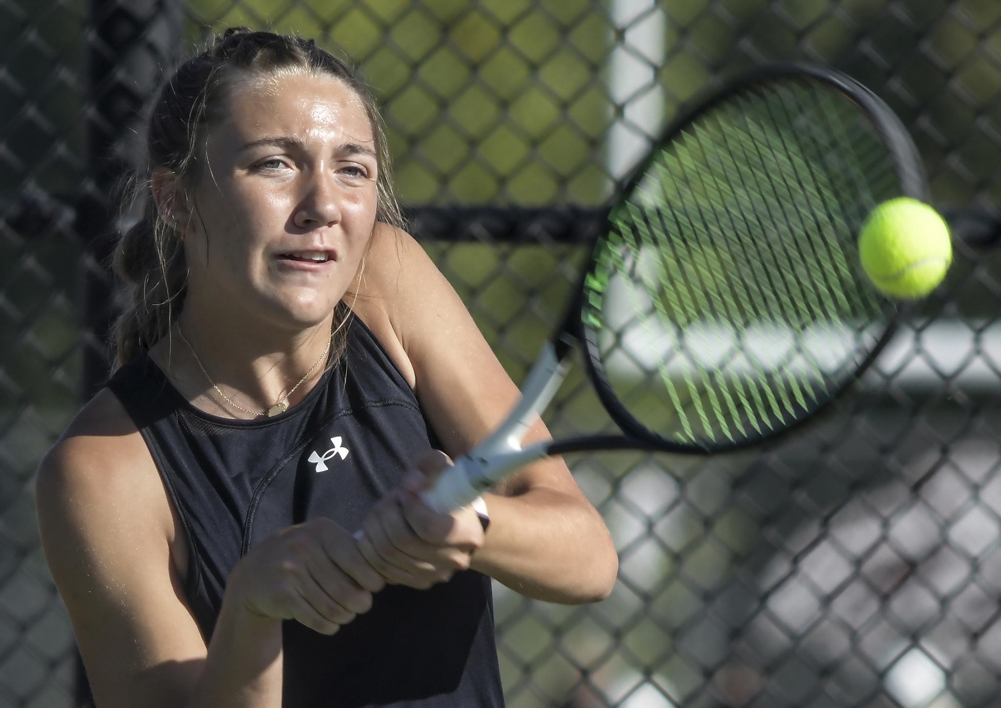 Garden City High School’s Chloe Ptacek hits a backhand shot in a singles match during the GCHS girls’ tennis invite in September. BRAD NADING/GARDEN CITY TELEGRAM