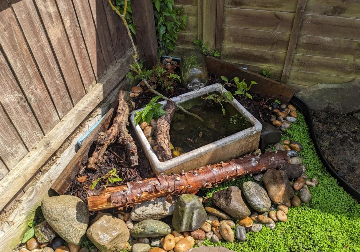 In addition to installing a lawn alternative and adding features like a path, the poster also built an eye-catching and unique solar fountain and miniature pond.