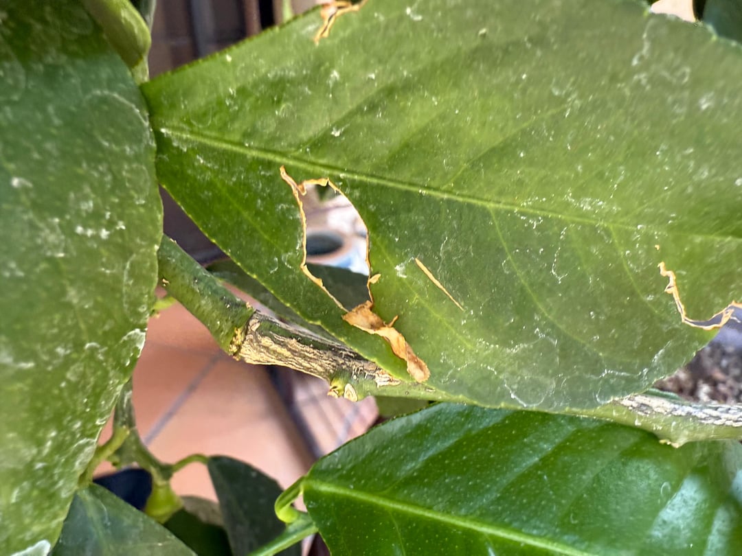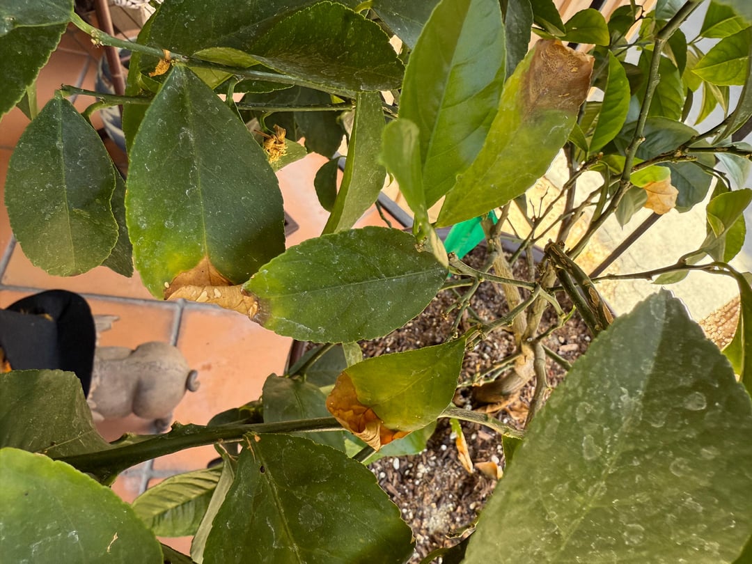 My friend asked me what might be causing this but I don't know enough about growing lemons to answer her question. She has been fighting a scale infestation for a few weeks, but she says they're dying down and she only has to pick off a couple here and there. In the beginning of the infestation she used an alcohol solution to help kill the scale, with manual removal as well, but she hasn't used any alcohol or neem or anything like that in a few weeks. This damage appeared recently. I'll comment or edit to add more info about watering schedule etc, when she gets back to me.