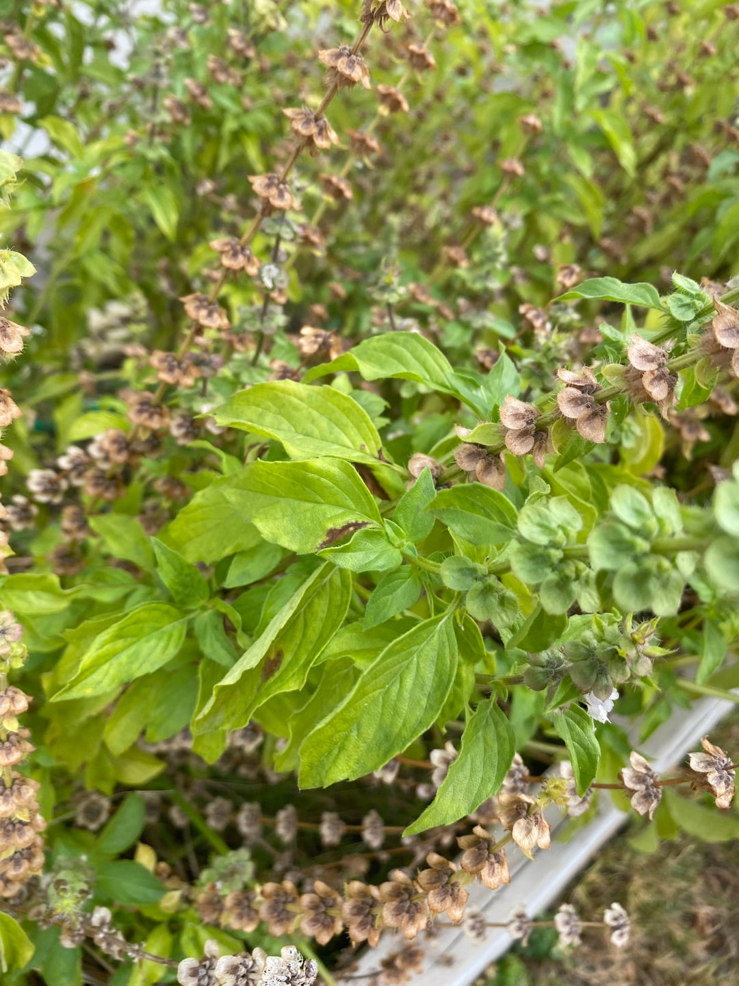 While it is never safe to eat something you don’t know the identity of, you can crush the leaves in gloved hands and smell them. If we are right and it is basil, the scent should be obvious. With that many, I would absolutely harvest those long seed heads and save the seed. Basil has viable seed with anything over 20 plants.