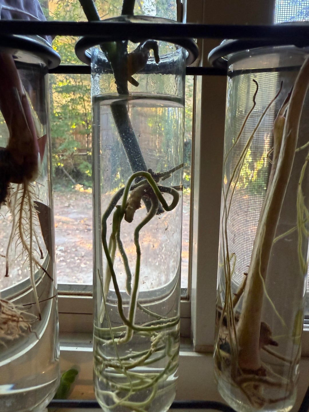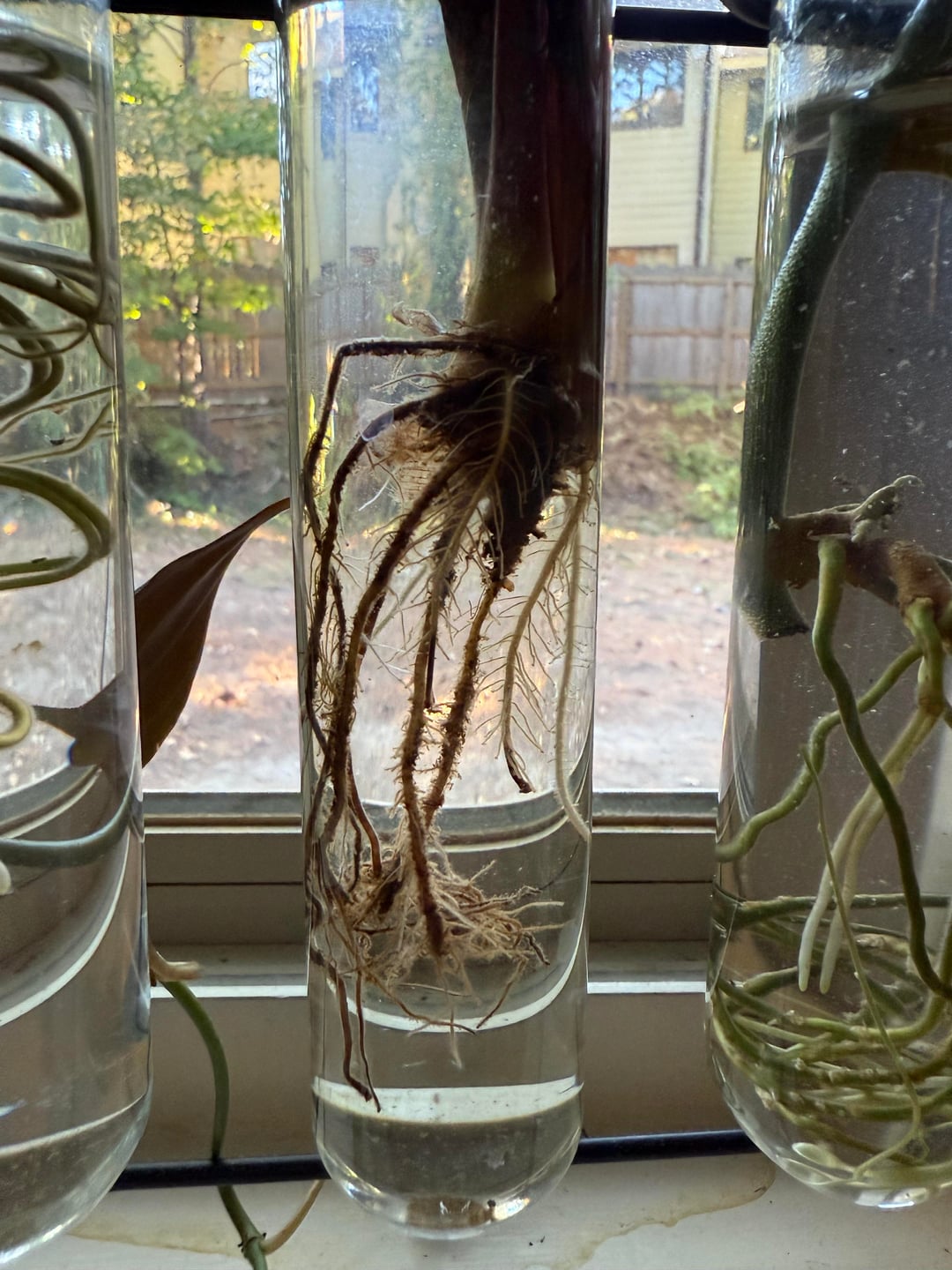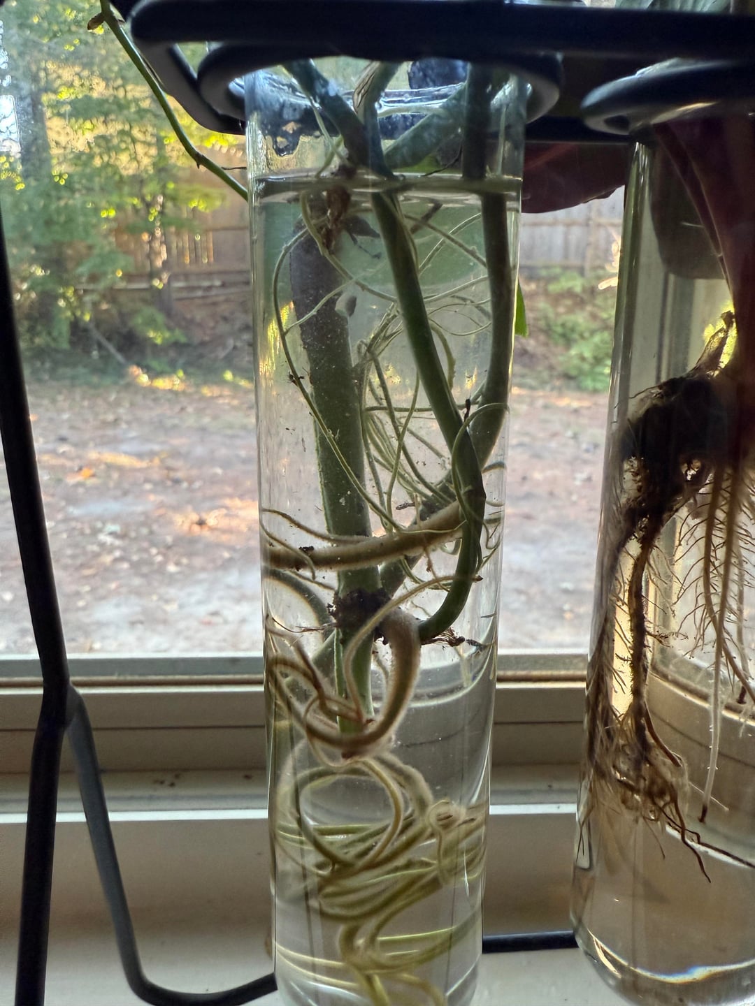 I was curious to know if I should move these to dirt, a bigger station, something else, or just keep them there until the spring. We’re moving into cooler weather and I don’t want shock or hurt the plants. They were all brought home (minus the Diffenbachia; squirrel broke that off and I threw it in a decanter) in May from a prop trade. All have new growth in there vials and are doing really well. All I have done is changed the water every few days. A few of them have roots coming out and that’s what’s making me worried. I forgot the names of the plants in the vials, but will add them on my plant app.