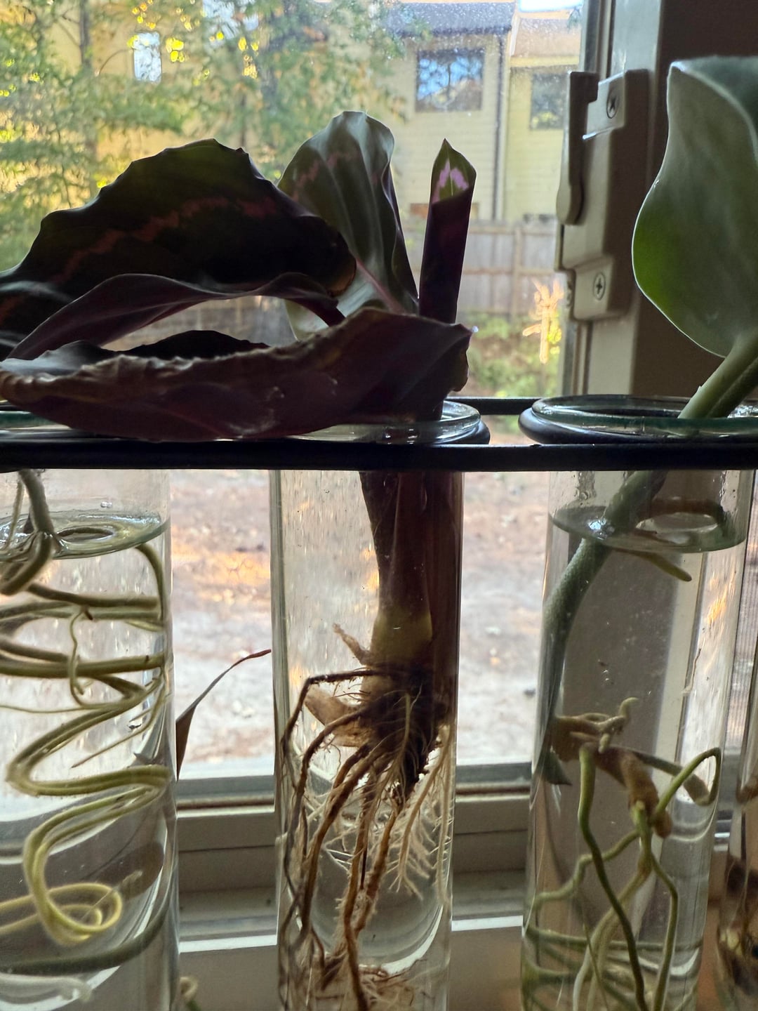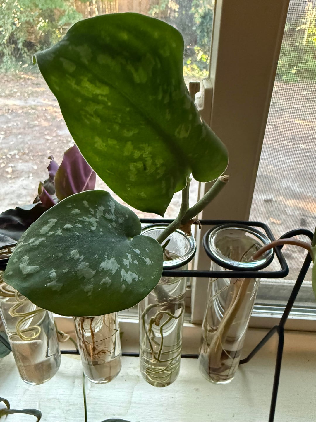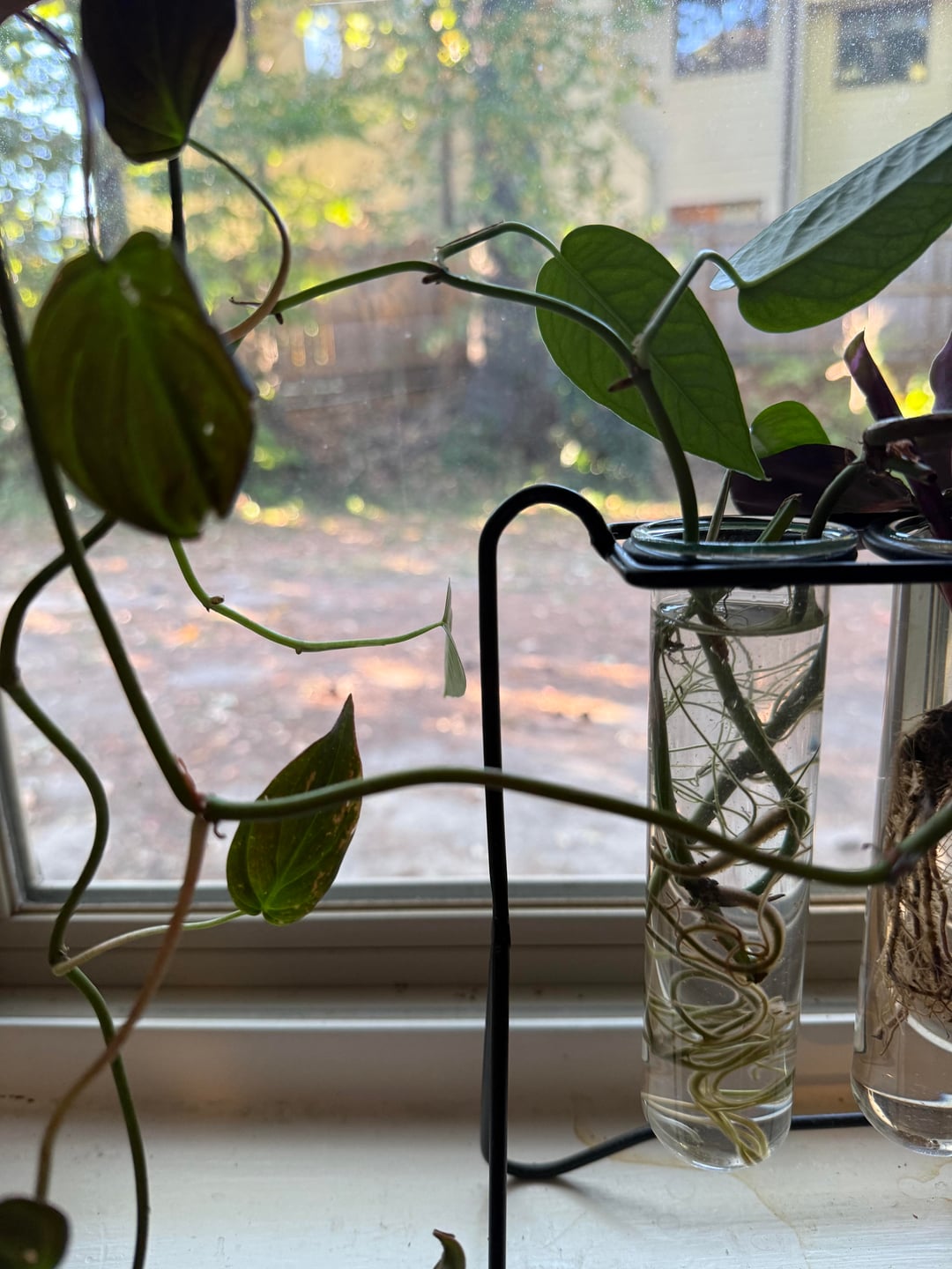 I was curious to know if I should move these to dirt, a bigger station, something else, or just keep them there until the spring. We’re moving into cooler weather and I don’t want shock or hurt the plants. They were all brought home (minus the Diffenbachia; squirrel broke that off and I threw it in a decanter) in May from a prop trade. All have new growth in there vials and are doing really well. All I have done is changed the water every few days. A few of them have roots coming out and that’s what’s making me worried. I forgot the names of the plants in the vials, but will add them on my plant app.