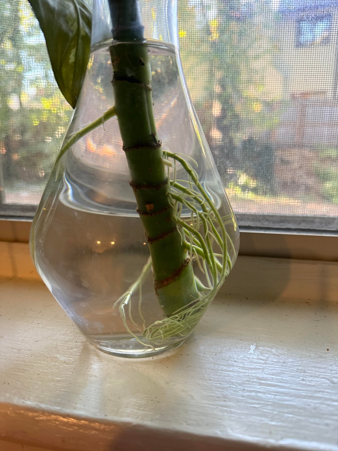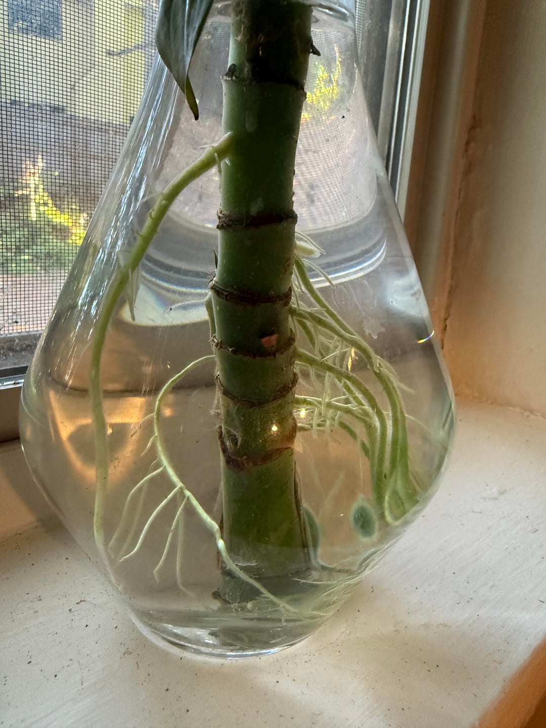 She’s lovely! They can live in water for quite awhile so just let her do her thing. Maybe throw in some liquid fertilizer when roots are more developed