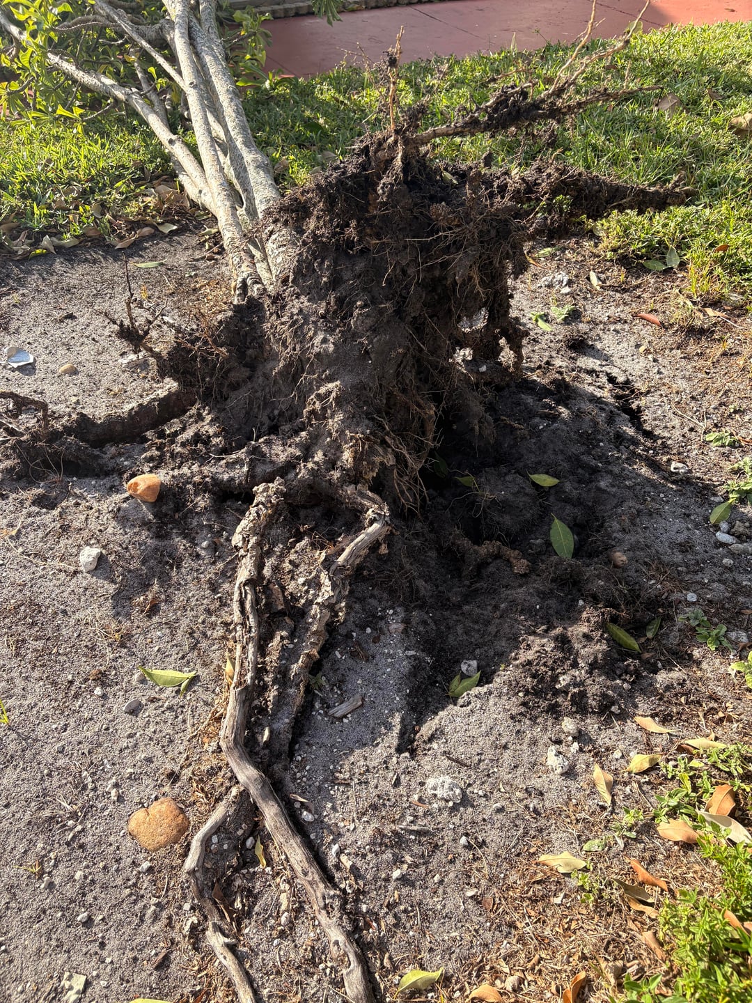 I hate to break it to you, but the wind didn’t knock your tree over. The tree fell because of a stunted root system. Look how small those roots are. There was something else that inhibited the proper growth of the root system. The wind may have been the final straw that broke the camels back, but the wind is not responsible for this failure.