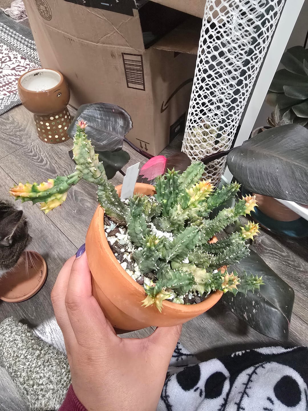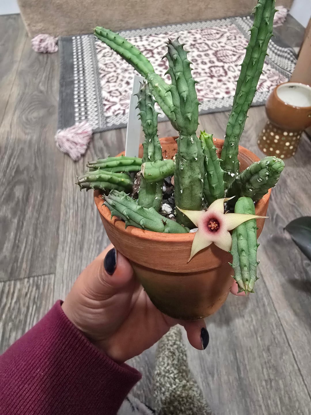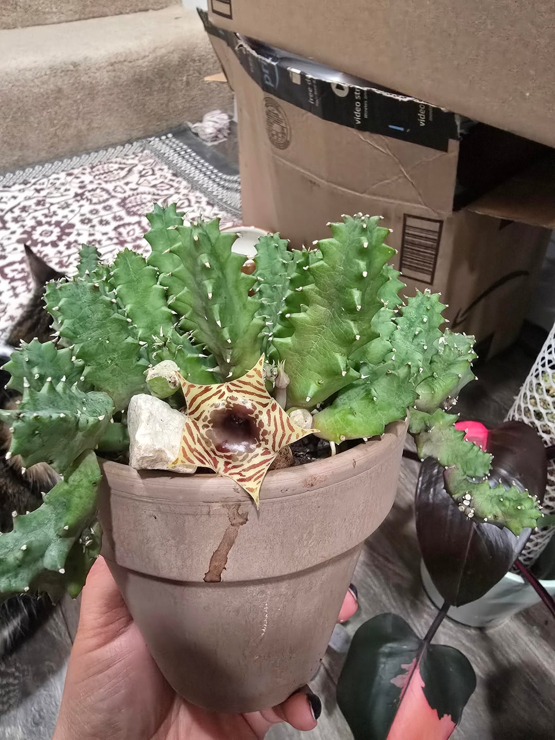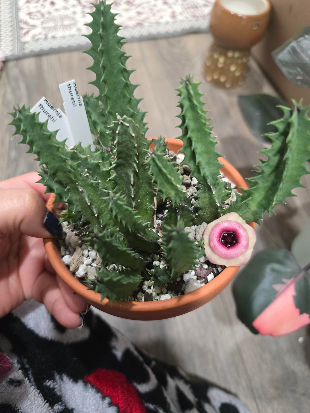 My huernia procumbens, has finally bloom, i thought me bringing it inside was going to stress it but it still managed to bloom, somewhere ones, my huernia thurentii and my zebrina have bloom too, I like how my zebrina's inner part color has changed with the temperature. An extra picture from zebrina variagata, I wish it bloom but it looks too pretty to not share