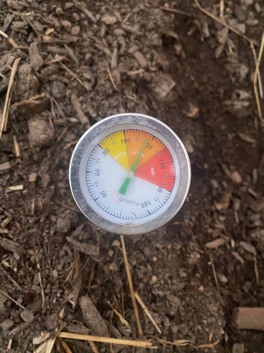 Pile started to cool so I flipped last week. Chooched right back to life!! 80f degrees pre flip to knocking on the door of 120f this morning with ambient temps in high 60s to high 30s over the past week. And a tickle of frost this morning. Next project will be making a drum sifter. Spring growing will be here before we know it!!
