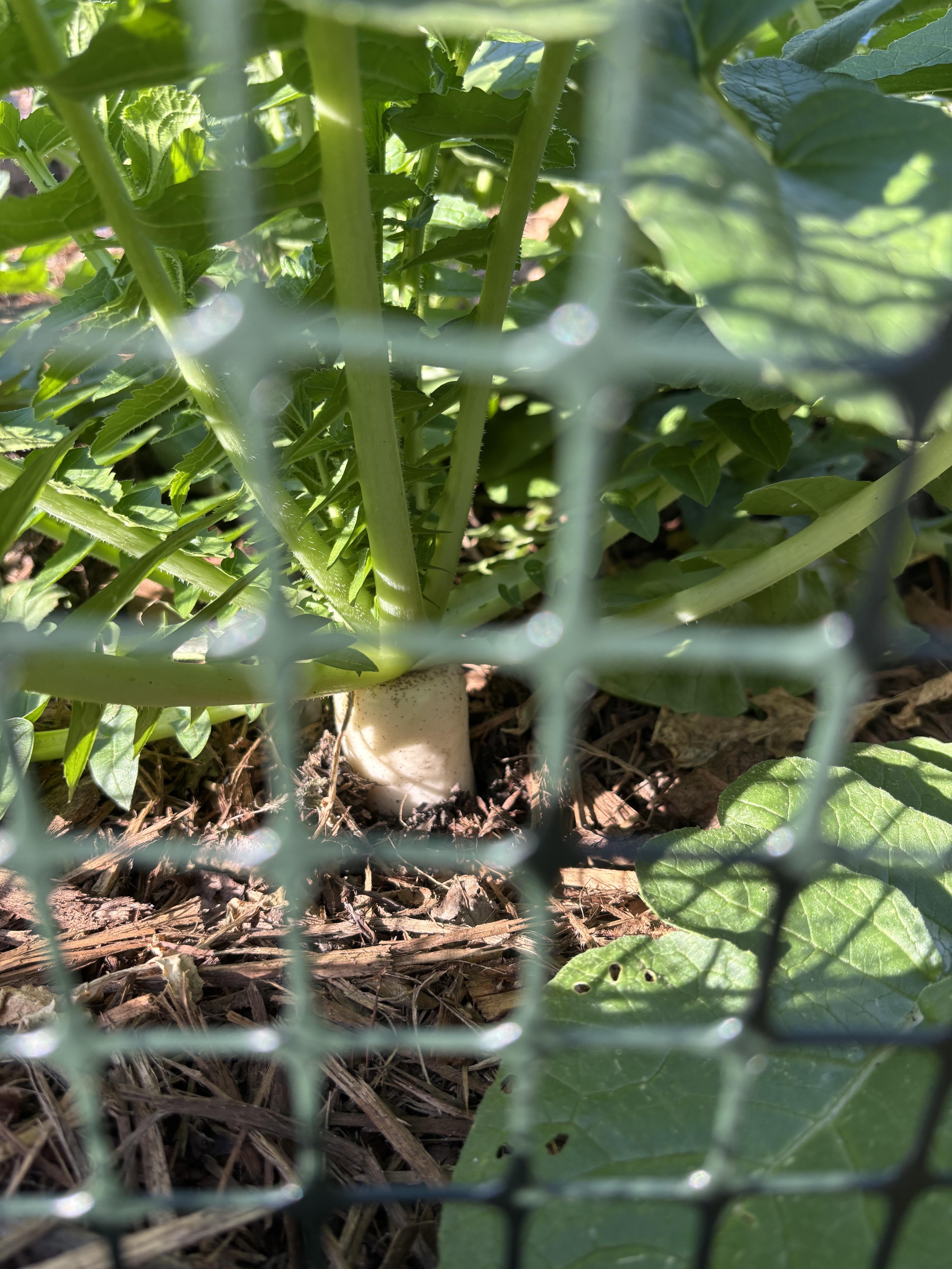 My first time doing daikon radishes from a starter – they've been in the raised bed about a month. Google says to wait till u can see their shoulders popping up but they look too skinny to me