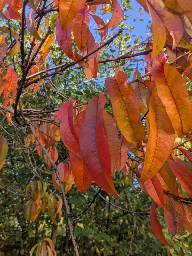 In the fall, the leaves of peach and nectarine trees turn a deep red and orange before they fall. Leave them under the tree for a lingering display of color and to help replenish the soil, and keep the weeds down (a little).