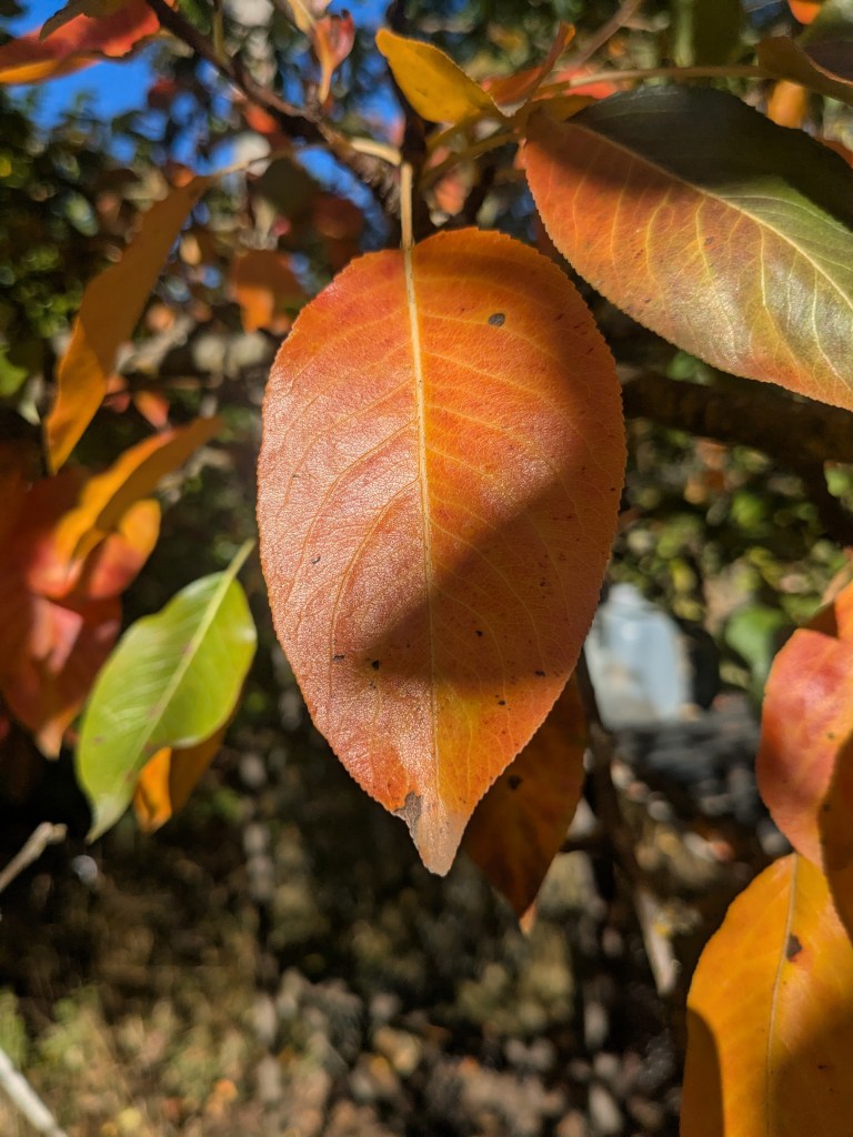 Bartlett pears — the most common backyard variety — also bloom spectacularly, and provide fruit, but their leaves go from green to brown. The winter pears — bosc, danjou, comice and others — have lovely fall color, and fruit that ripens slowly after a period of chill. We often have pears well into April by leaving them in the fridge for three months after picking. Pears are not as pest-free as peaches and nectarines, but they are less prone to bugs than the summer Bartlett, in my experience.