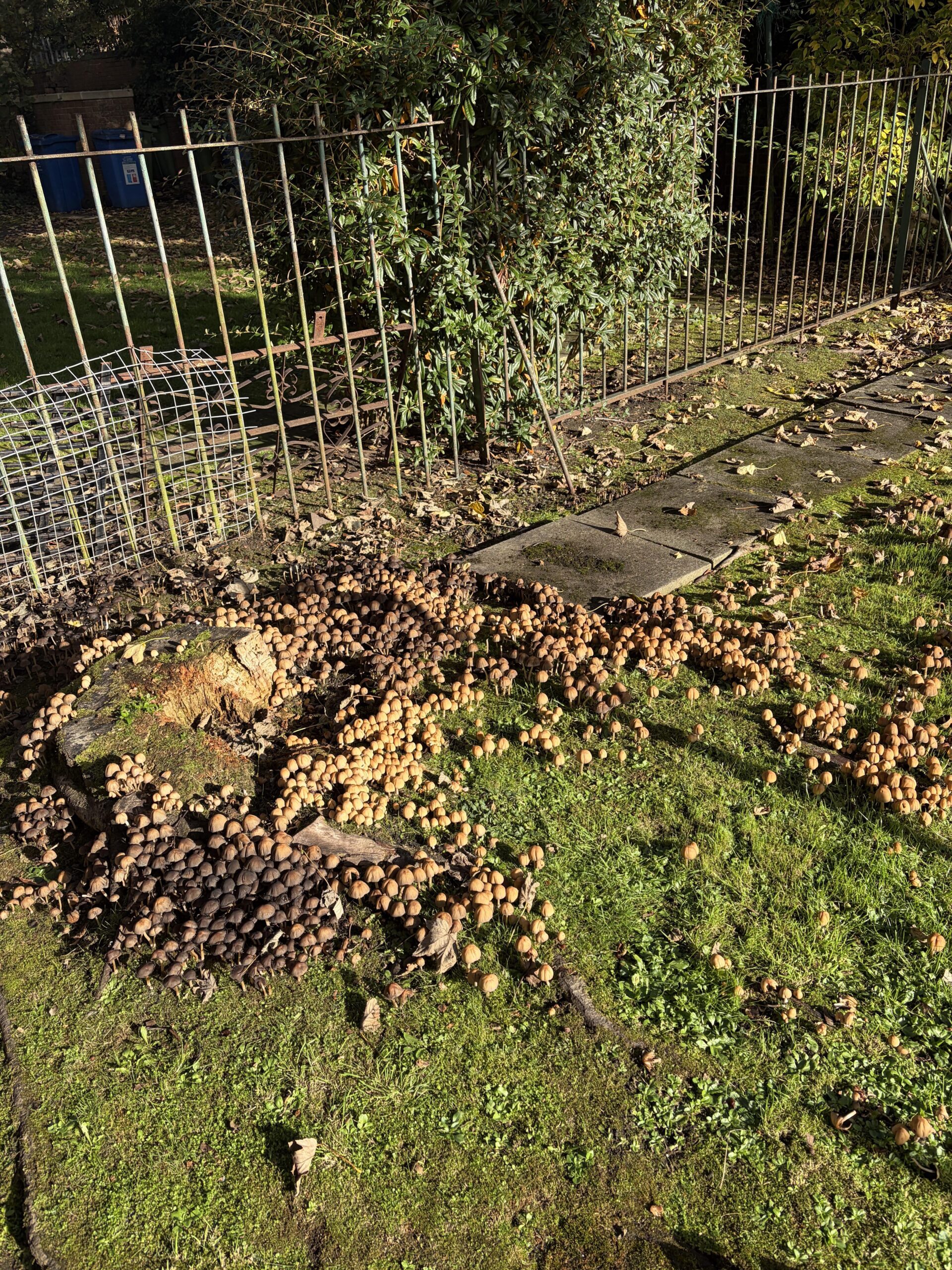Tree was cut down around 18 months ago due to it presenting a danger to the building. Now noticing these mushrooms growing up from what I assume are the dead / dying root system.
