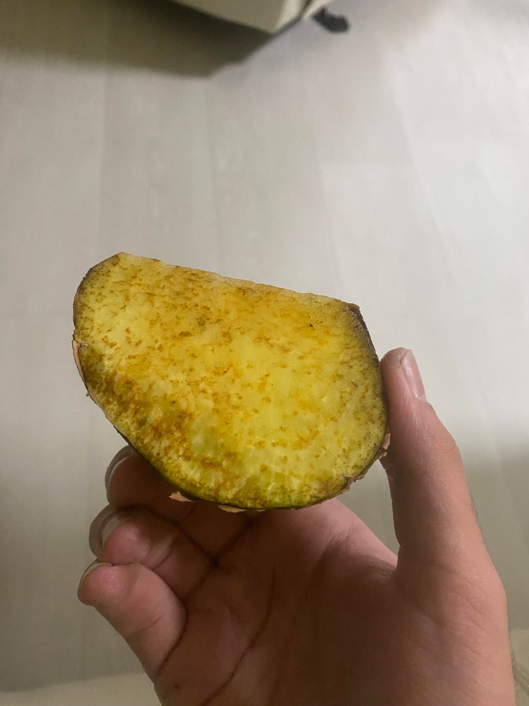 This ones about the size of a potato, but i’ve seen some way bigger! It has a rough texture with spots, and the inside is yellow with a green outline sort of like an avocado