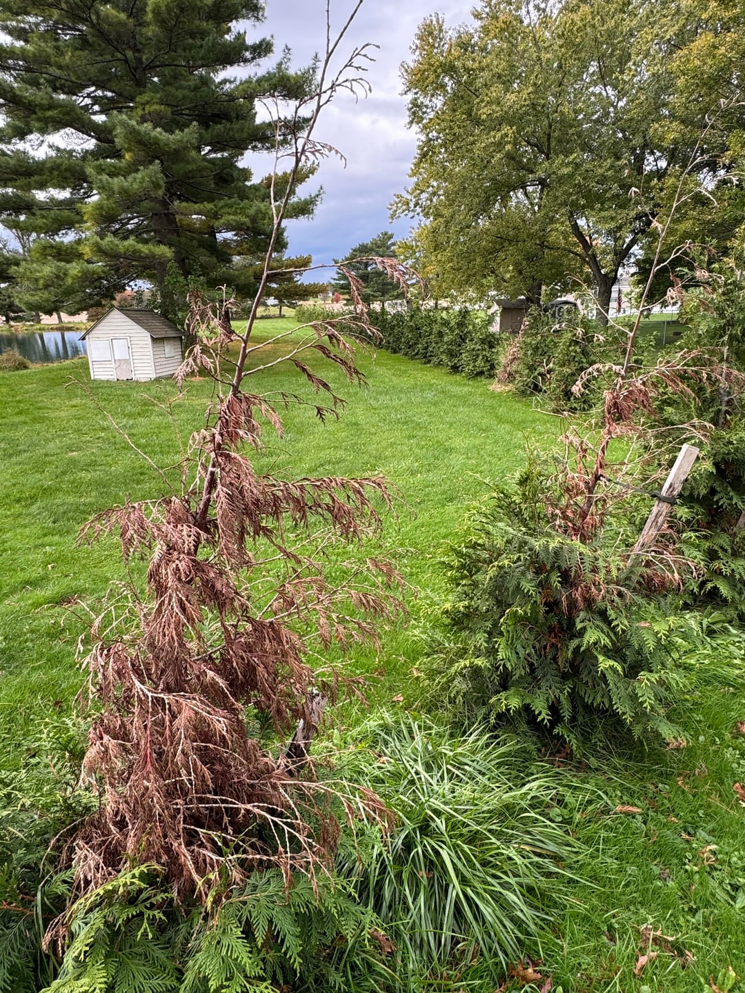 By March of this year many of the trees didn’t look great – yellowing/browning mostly. We were told it was likely planting shock and winter stress. That turned out not to be true. By May we had almost an entire row full of dead trees.