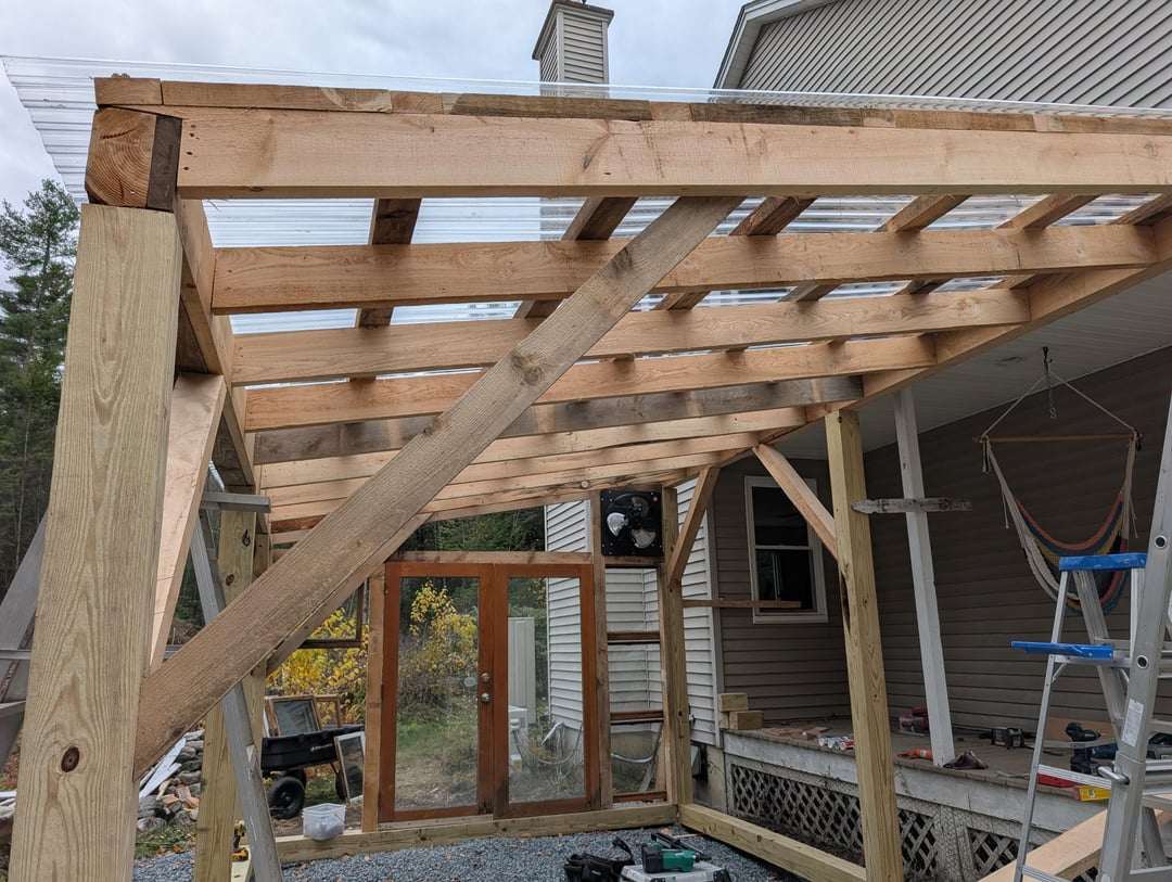 Awesome. I would recommend using braces for the rafters instead of toenailing them in. If you get snow, this could collapse on you. Not too late to add them now, would be an easy fix. Best of luck!