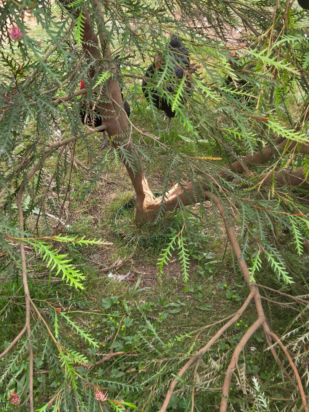 Drill a hole and put some all thread through it put a hole into 2 pieces of 2×4. Nut and washers on the end. So it goes nuts washer 2×4 tree 2×4 washer nut.