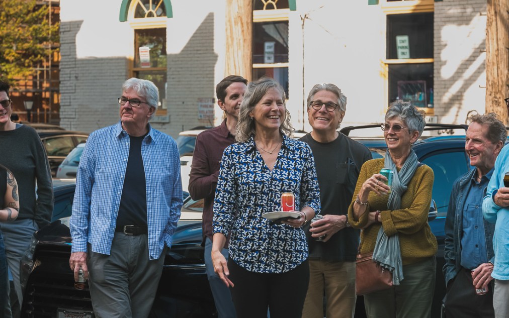 Contributed photo Brigid Murphy (center) attends a private reception on Oct. 8, 2025 for a garden at Multistudio, 706 Massachusetts St., dedicated to her late husband, Jackson Clark.