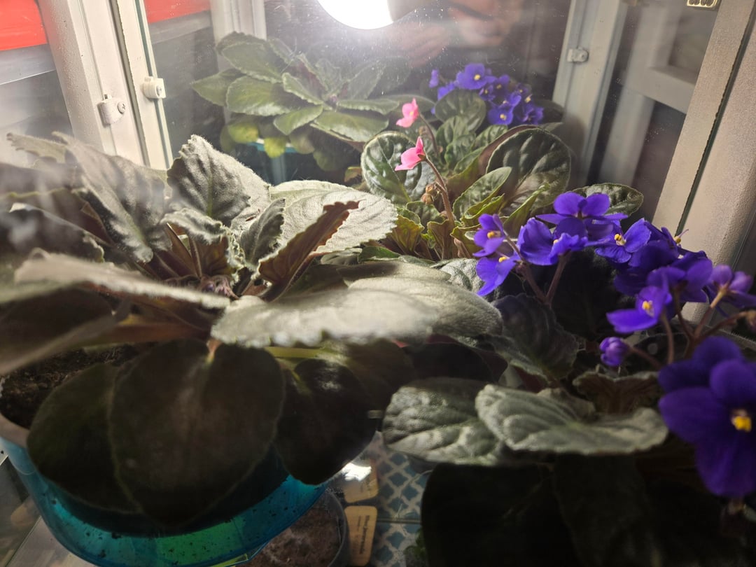 I knows its a little difficult to see because of the glare and the dog snoot smear, but the small pink one in the back is on a 3rd set of blooms this year. The purple flowers at front right is on its 2nd bloom; this one is actually from a leaf prop from the large one at left front.