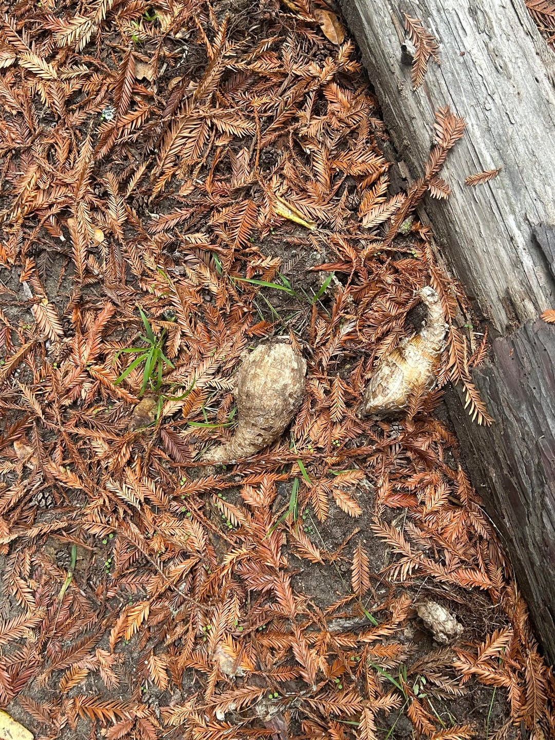 reminds me of the dropped needles of bald cypress, Taxodium distichum. if the woody knobby things are embedded within the ground, they may be short “cypress knees,” above-ground growths of bald cypress roots believed to be an adaptation to access air in their often moist environments.