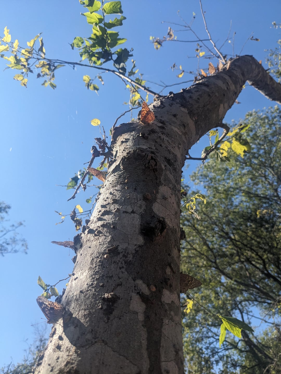 Is the sap bubbling out of the tree anywhere? It’s likely that the tree is harboring a bacteria that is fermenting its sap, which makes it attractive to butterflies. This happened to my giant live oak one year and it freaked me out, but the tree recovered on its own. If the tree looks unwell, though, you might need an arborist.