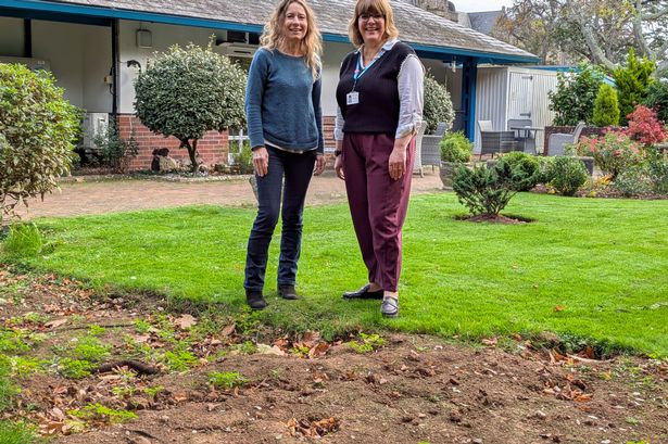 Topsham firm HCT Turf has donated turf to revive Hospiscare’s Searle House gardens, chosen as the winner of its ‘Turf it Forward’ community campaign Steff Dennis from HCT with Sharon Ewart from Hospiscare