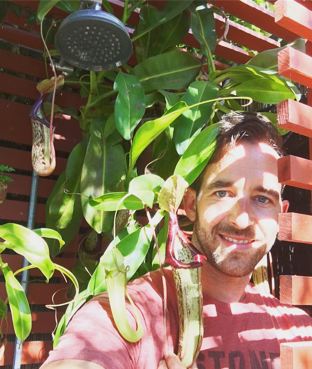 Most tropical pitcher plants (Nepenthes) enjoy dappled sunlight👍 Slats seem to do the trick in our outdoor shower habitat🌿☀️ #Nepenthes #tropicalpitcherplant #nepenthesmiranda #carnivorousplants #thehorticultgarden