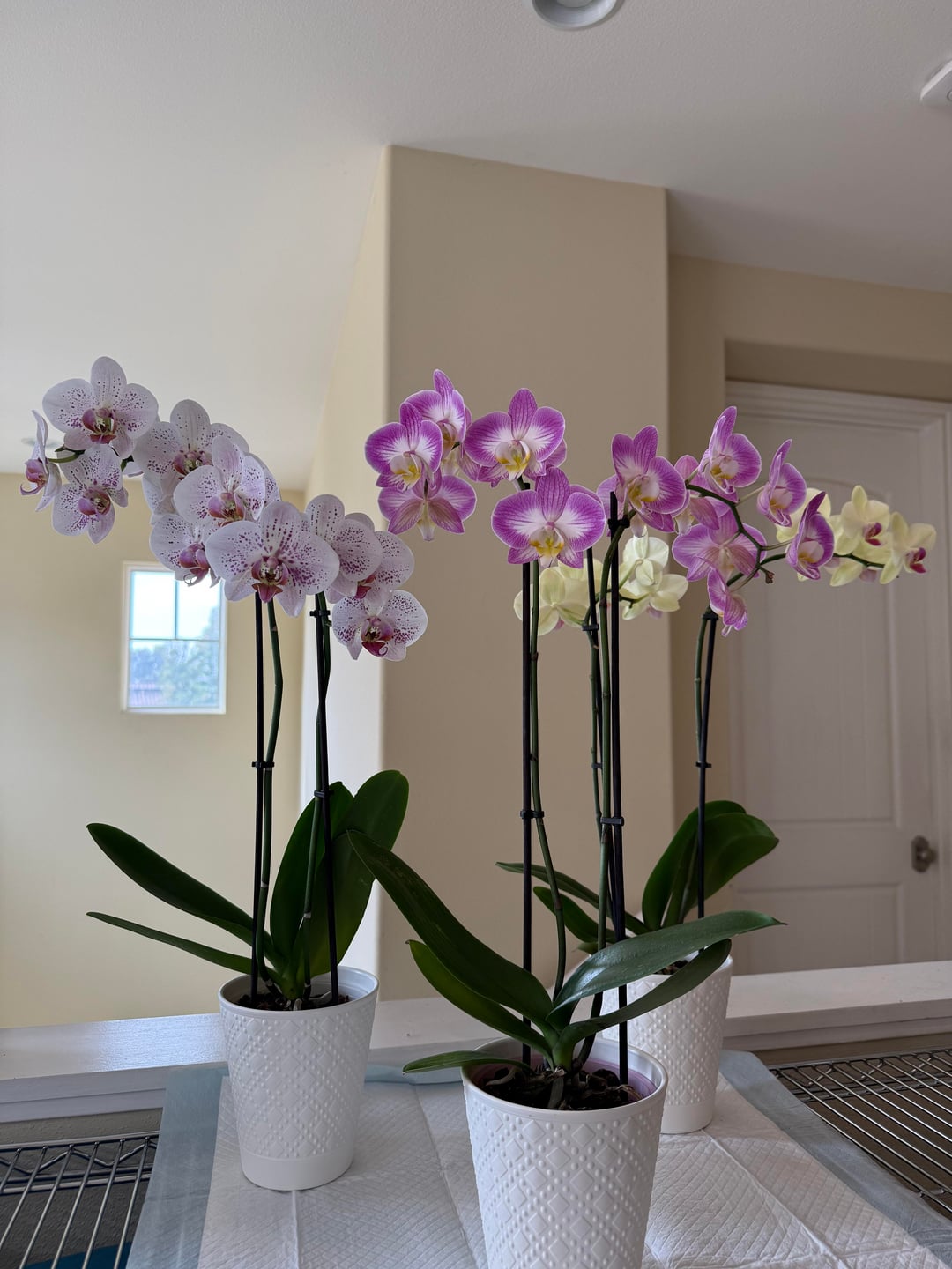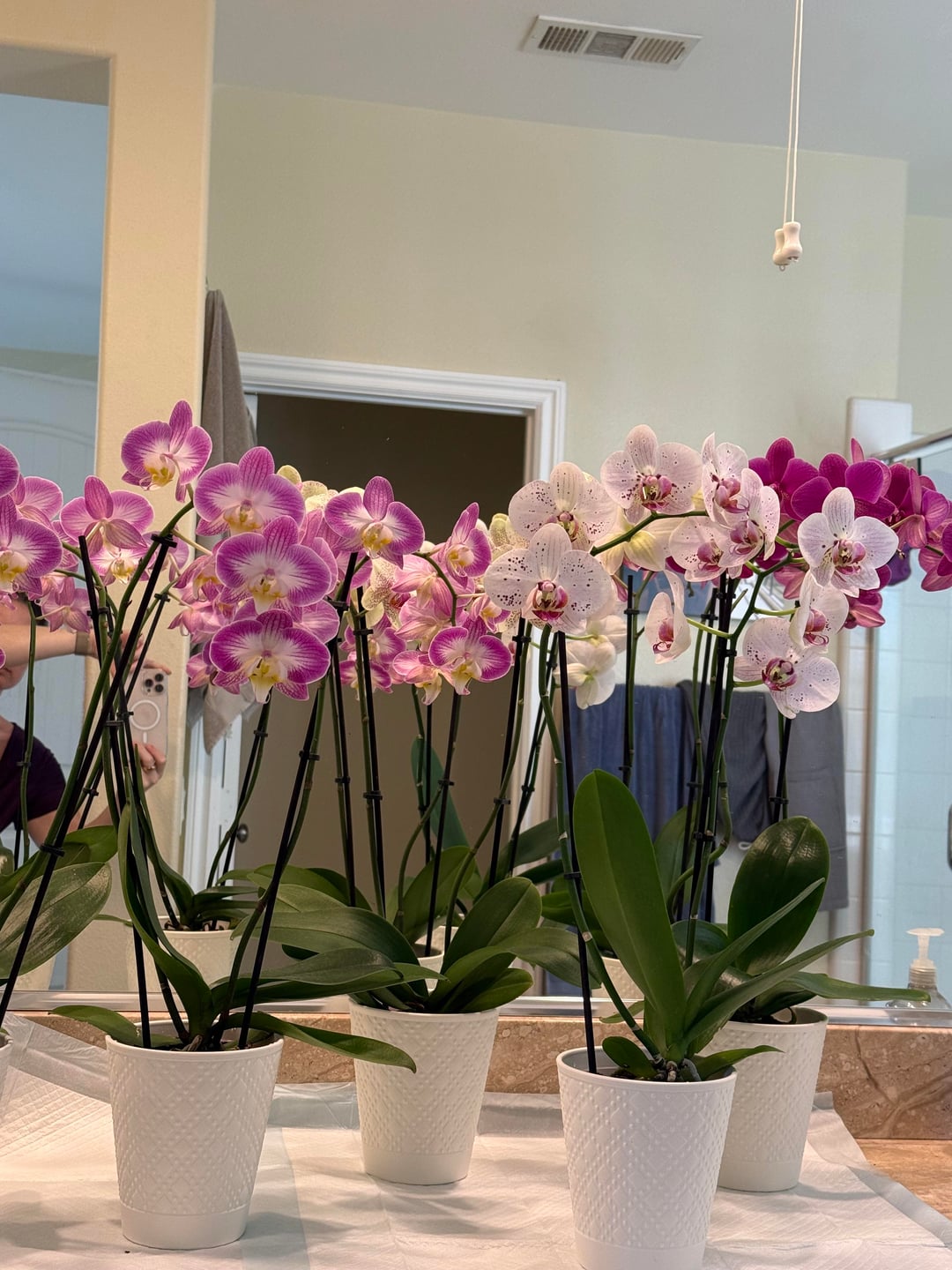 I received my first orchid with bottom watering instructions on the care tag in February. This unlocked a fascination with orchids and led me on a journey of learning more about their care, thanks in large part to this sub. I’ve recently celebrated my first re-bloom (of the original Feb orchid) and have a few with first-time spikes (SO exciting). From one to 23…and many more to come!