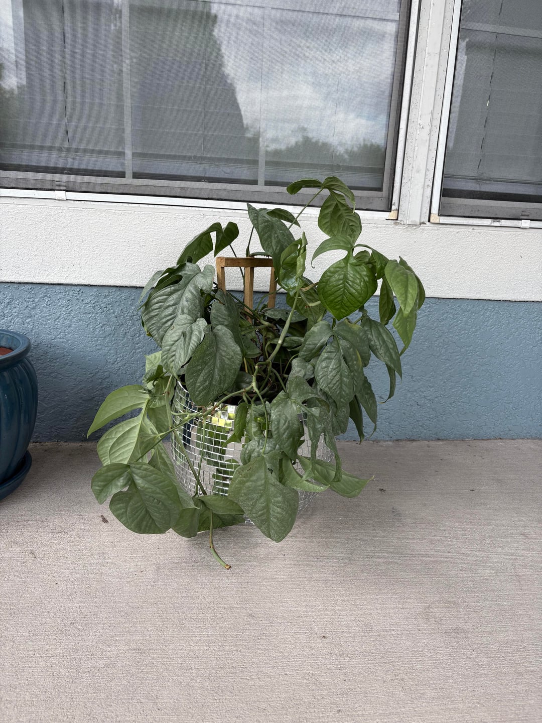 I’m new to houseplants so have patience with me. My wife bought us a Spiderman monstera and it has this little ladder thing but it’s not nearly tall enough. I have seen videos and “how to’s” on attaching monstera to moss poles. Would that be the same concept with this. Im assuming it needs a pot change, would the big blue pot with a drainage hole work if not what would be a preferred pot for this type of plant. I think I have a good location picked out for it right now and a backup indoor location if outside is too much.