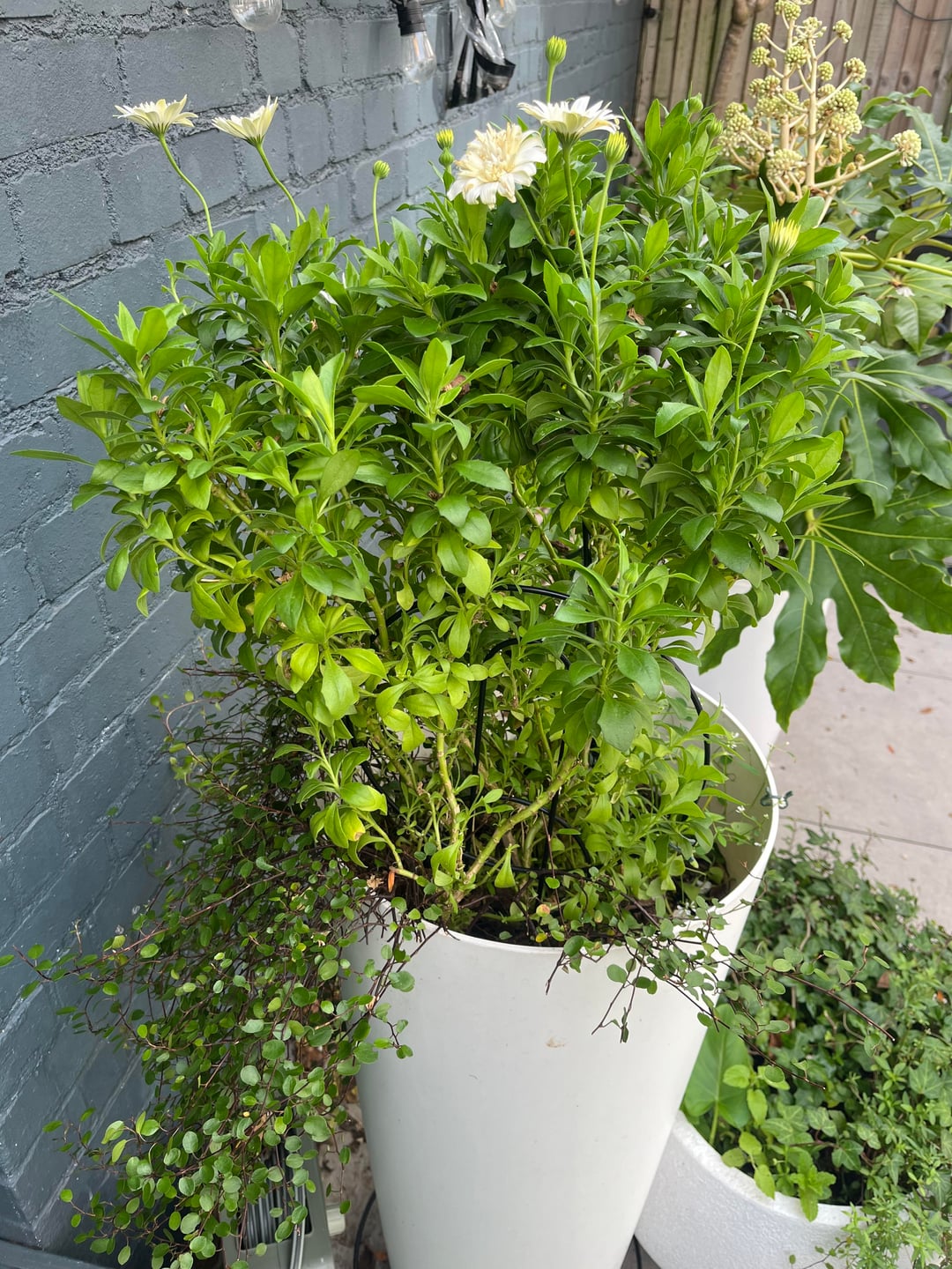 Any advice welcome! Will these white flowers in a (plastic) pot be ok outside in winter? Should I trim them? Move them?
