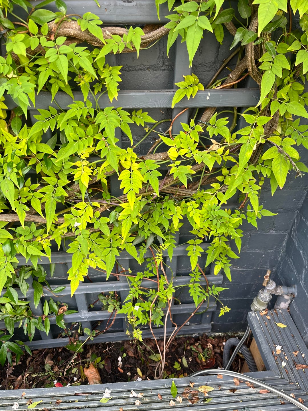 Not sure what the white flowers are, but the climber is a wisteria – they lose their leaves in winter, so it’s looking fine for the season!