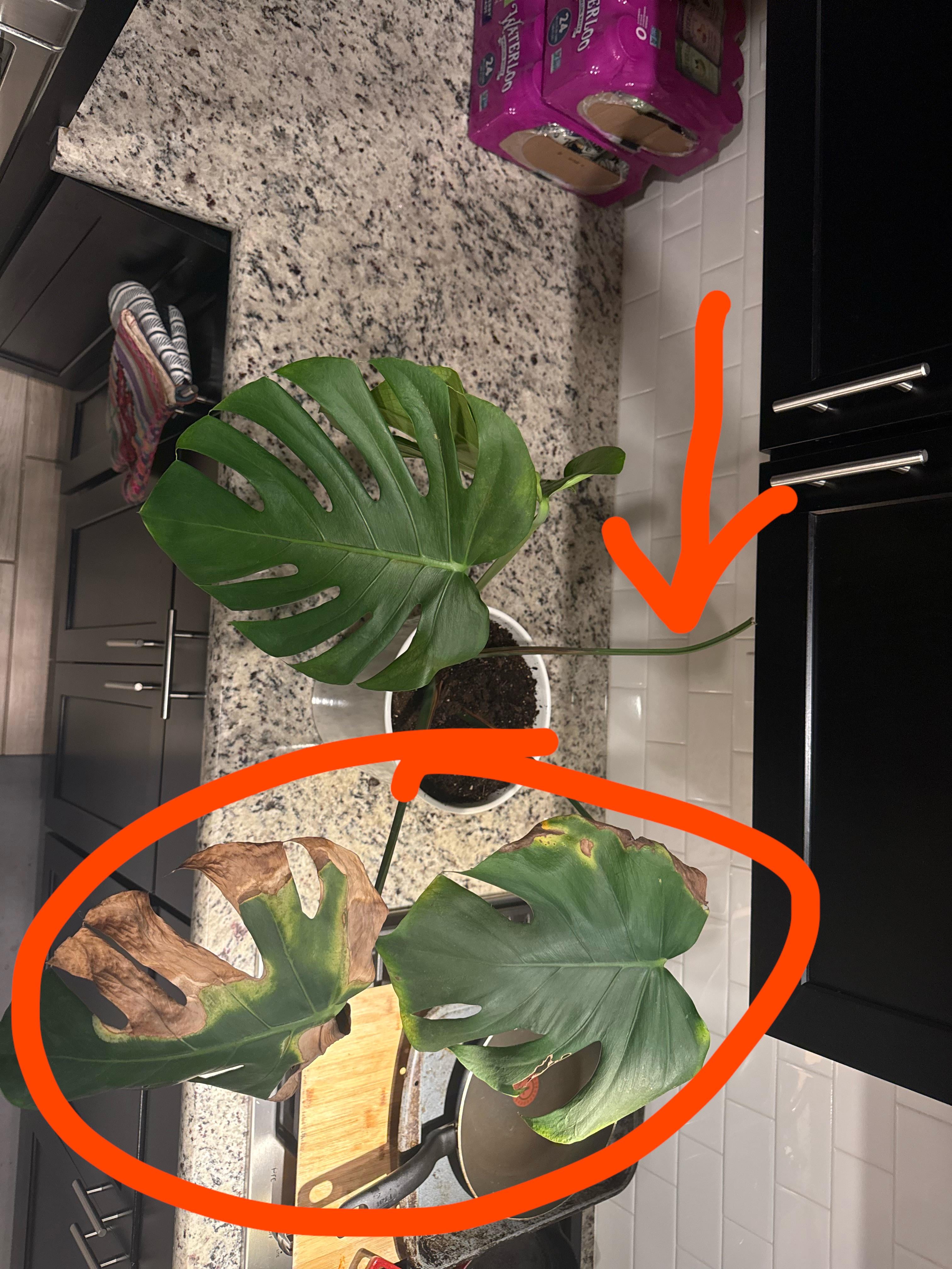 Look back at my profile to see her progress 🥰 however, I’ve had a mishap and my cat damage the first new leaf (red arrow). What should I do about the leafless stem? Also, what to do with the original leaves (red circle)….if anything. Suggestions on a how to keep her thriving and producing leaves would be welcome! Thank you