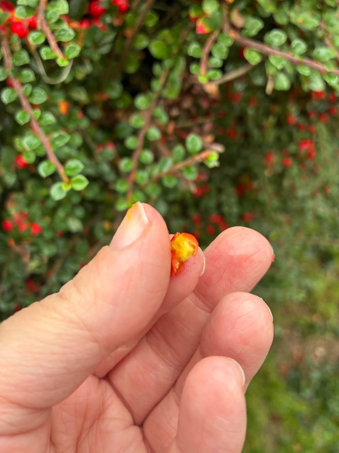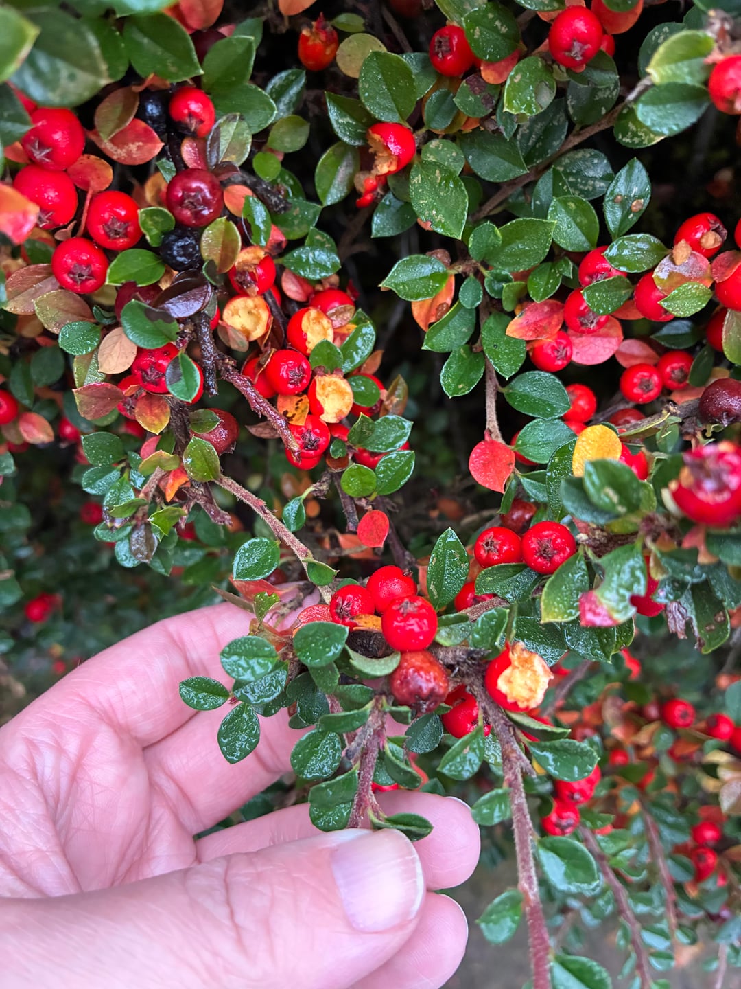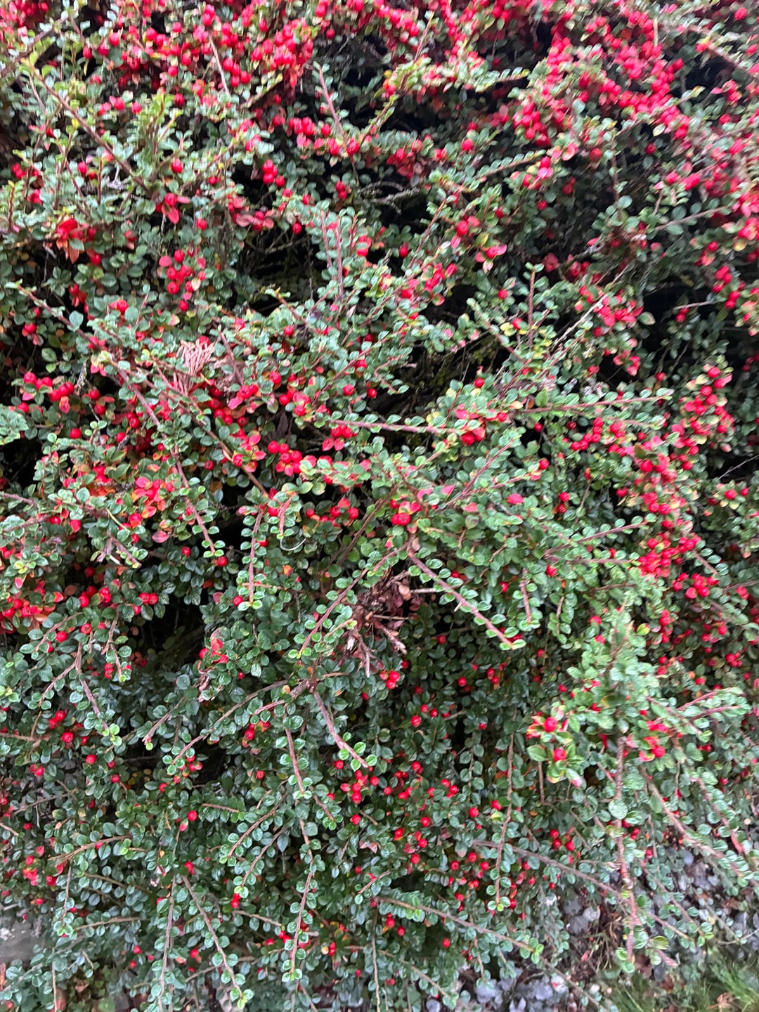 Cotoneaster. Birds and mice eat the berries but I don’t know if they’re harmful for dogs