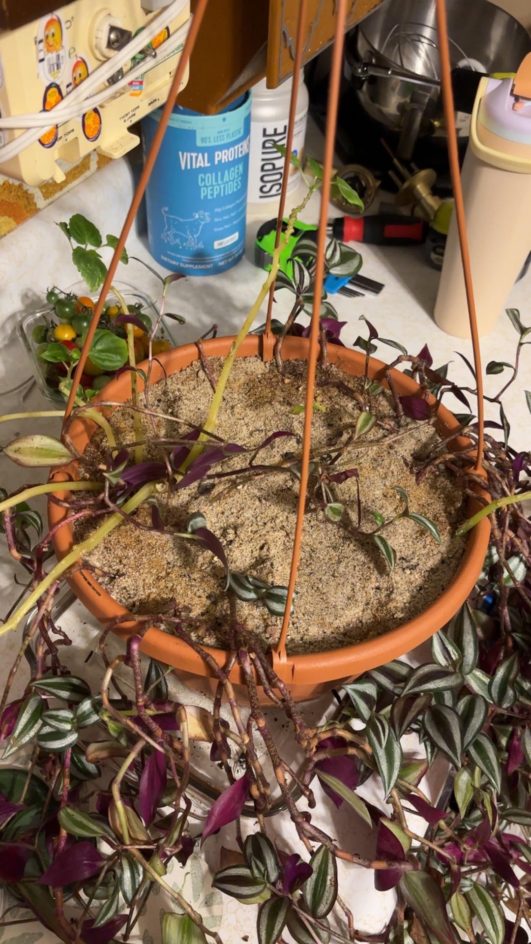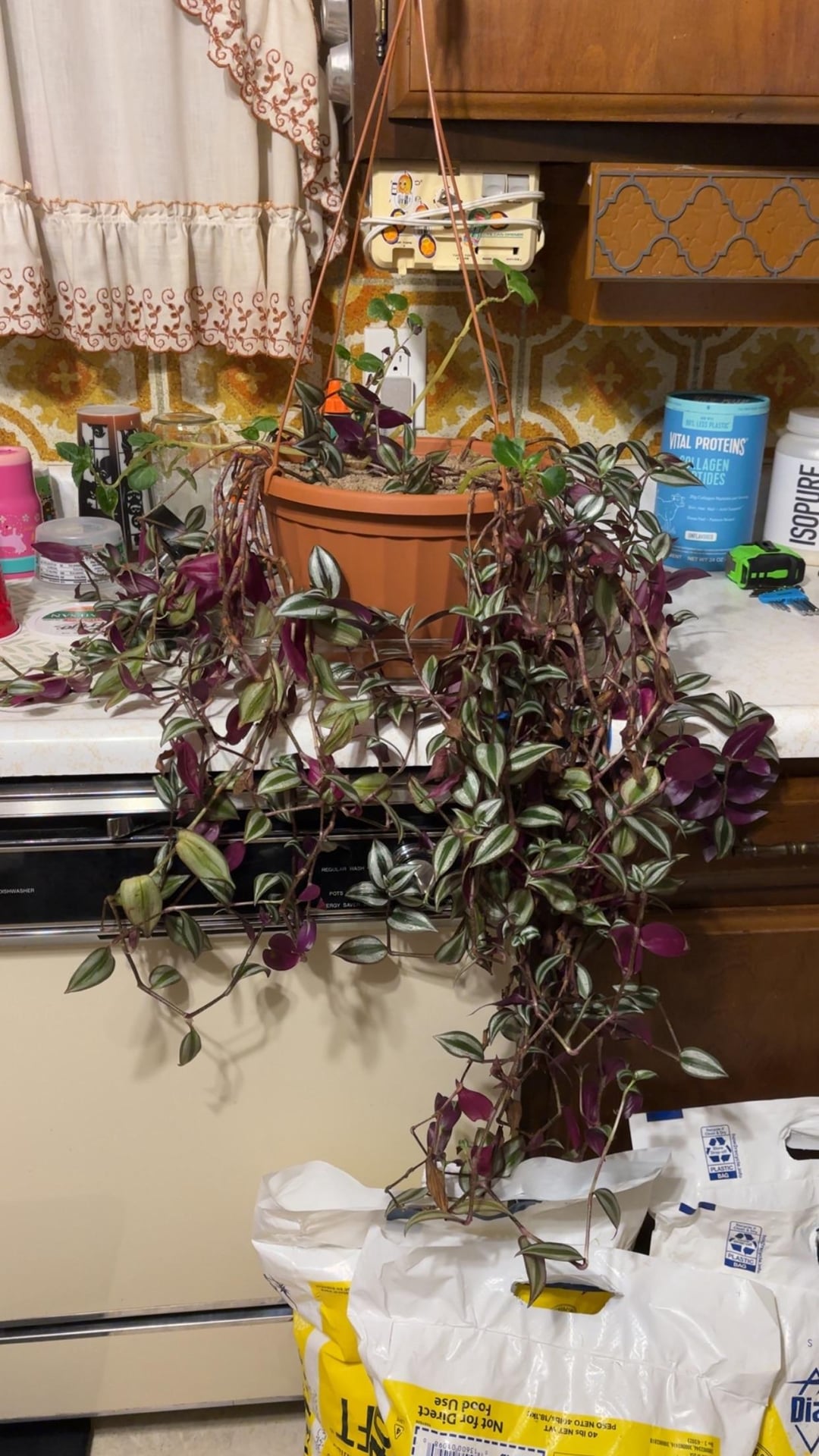 My best bet as to your issue, though, is light: get your eyes level with where the top of the pot normally hangs, and look out the window. Can you see the sky? If not, try adding a loop of sturdy cord to your setup so it hangs lower, or adding a grow light directly above it. Plants need light on their crowns — even if they’re getting a ton on the lower vines, if the leaves near the roots aren’t getting enough, they’ll start dropping.